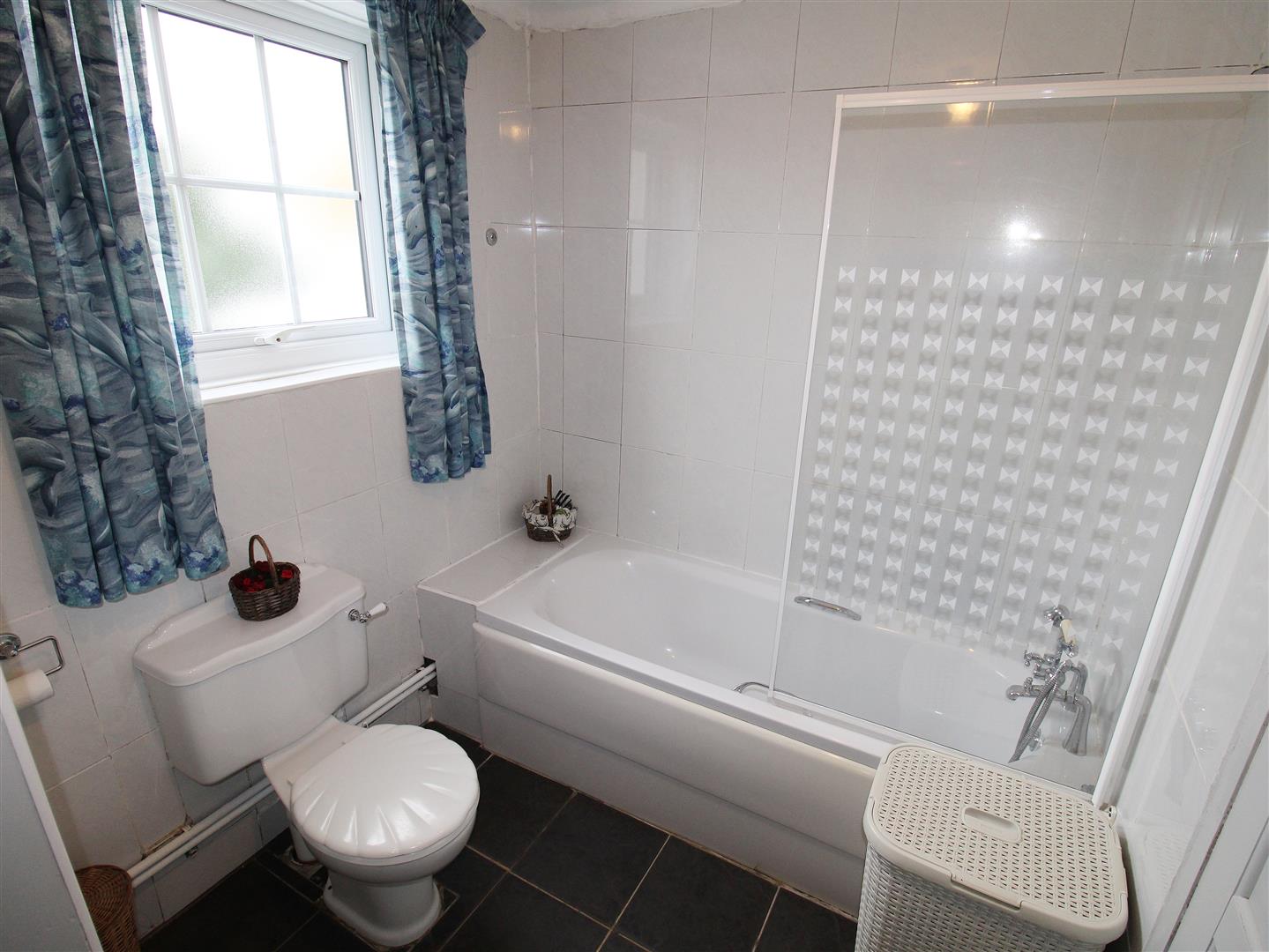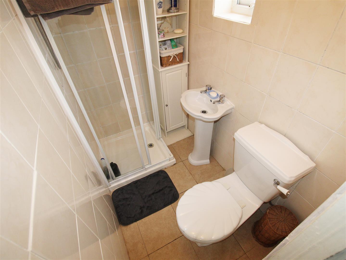 Textured and coved ceiling. uPVC double glazed window to rear. Fully tiled walls and floor. Low level WC. Pedestal hand basin. Panelled bath with mains fed shower and screen over. Very large shelved cupboard housing hot water cylinder. Stainless steel electric towel rail/radiator.