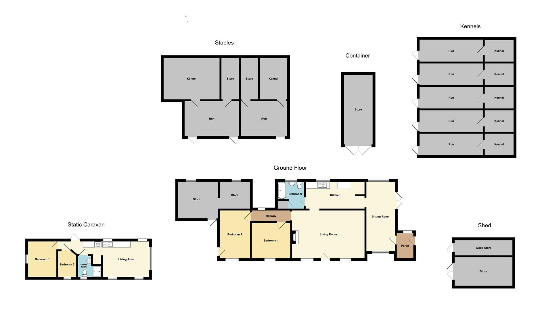 Externally, adjoining the side of the bungalow, is a store which is partitioned into 2 areas. Further to the side is a 2-bedroom static caravan, ideal for visiting guests, or perhaps to give some independence to an older child, offering an open-plan living room with a kitchenette and a shower room, as well as a double and a single bedroom. To the rear of the bungalow, there is a very pretty, enclosed garden, laid to lawn, with established and well-kept shrubs, bushes and trees. Beyond the garden, there is a block of 5 kennels with runs, all benefitting from lighting and heating, as well as a stable block which has been utilised by the current owners to create 2 further kennels with runs, all with power and water, as well as 2 stores. Further storage is provided in the shipping container, as well as the large shed which has been divided into a main storage area and a wood store. With off-road, gated parking for multiple vehicles, this really could be your retreat from the hustle and bustle of everyday life.