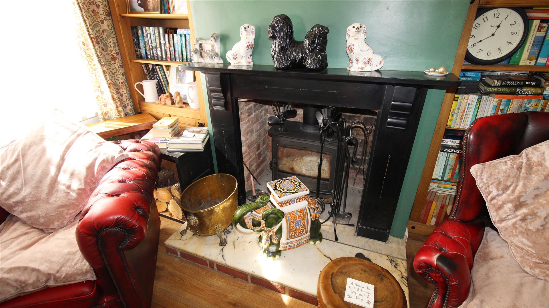 Coved, textured ceiling. 2 x ceiling light pendants. 2x wooden-framed, single-glazed windows to the front. Multi-fuel burner set on a marble hearth with a brick surround and a wooden mantle. Radiator. Power-points. Wood-effect laminate flooring.