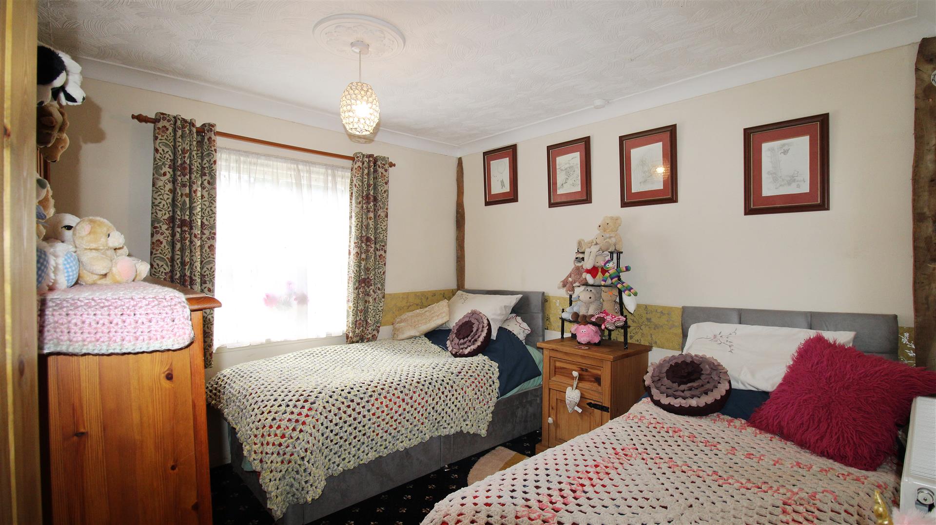 Coved, textured ceiling. Ceiling light pendant. Wooden-framed, single-glazed window to the front. Radiator. Power-points. Carpet flooring