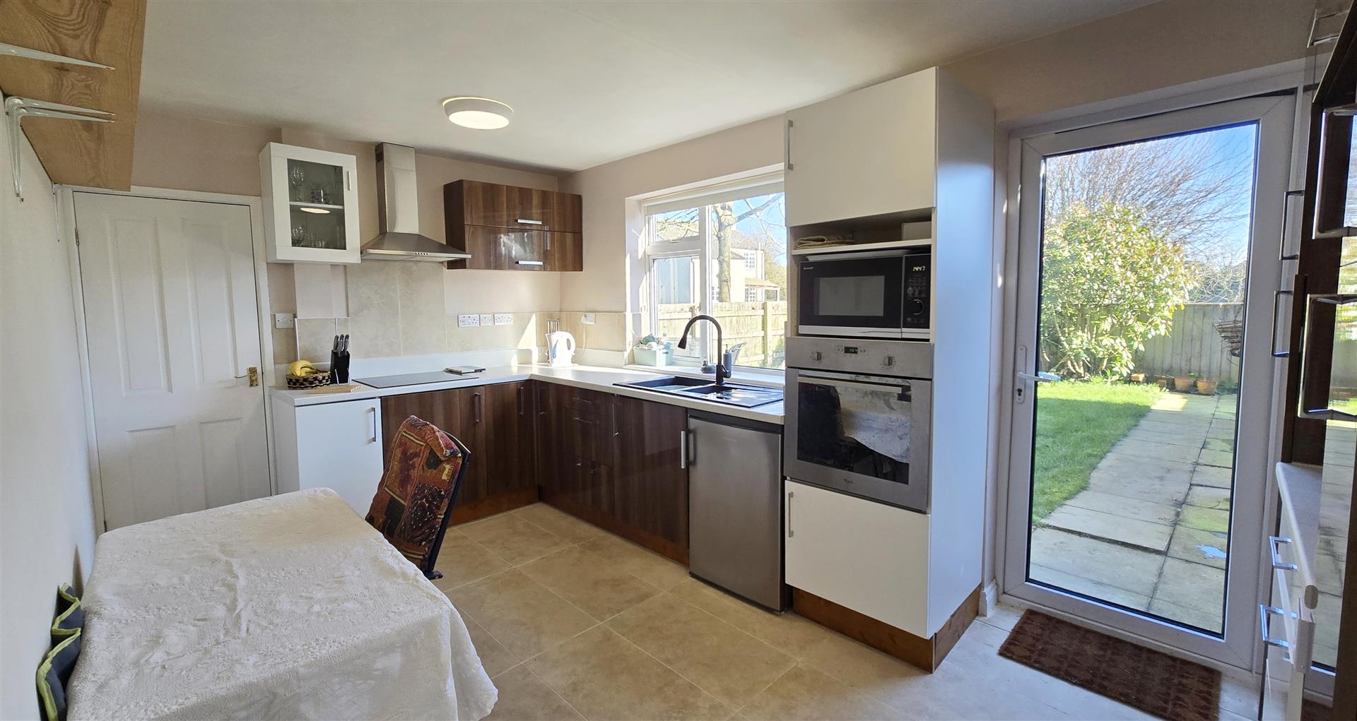 2 x ceiling lights. uPVC double-glazed door to the side. uPVC double-glazed window to the side. Fitted range of wall and base units with a worktop over and a tiled splashback. 1 and 1/2 bowl sink and drainer with a pot-wash tap. 'Noxton' ceramic hob with a stainless steel extractor over. Eye-level 'Whirlpool' oven. Under-counter space for a fridge. Radiator. 6 x double power-points. Single power-point. Tile flooring.