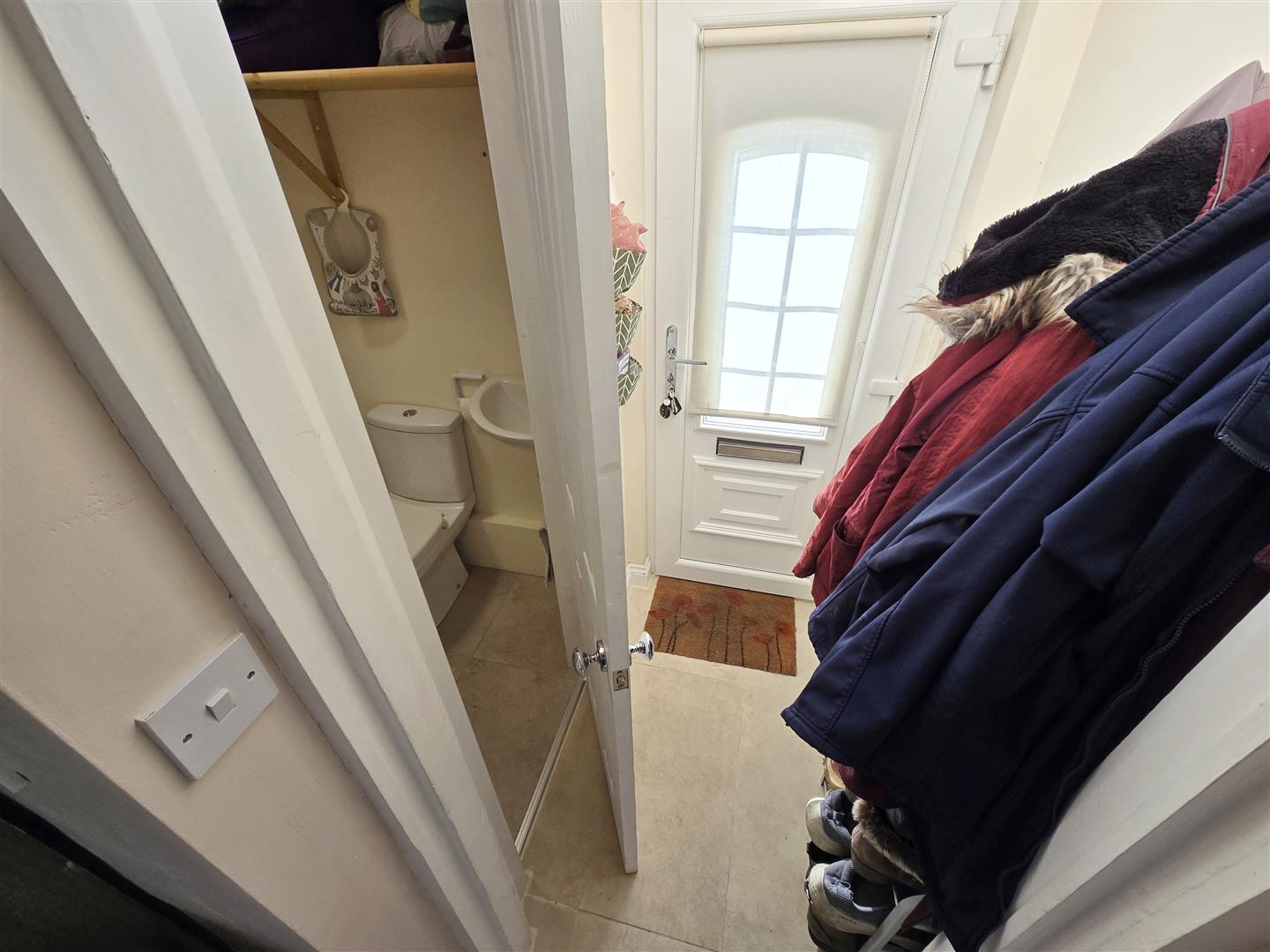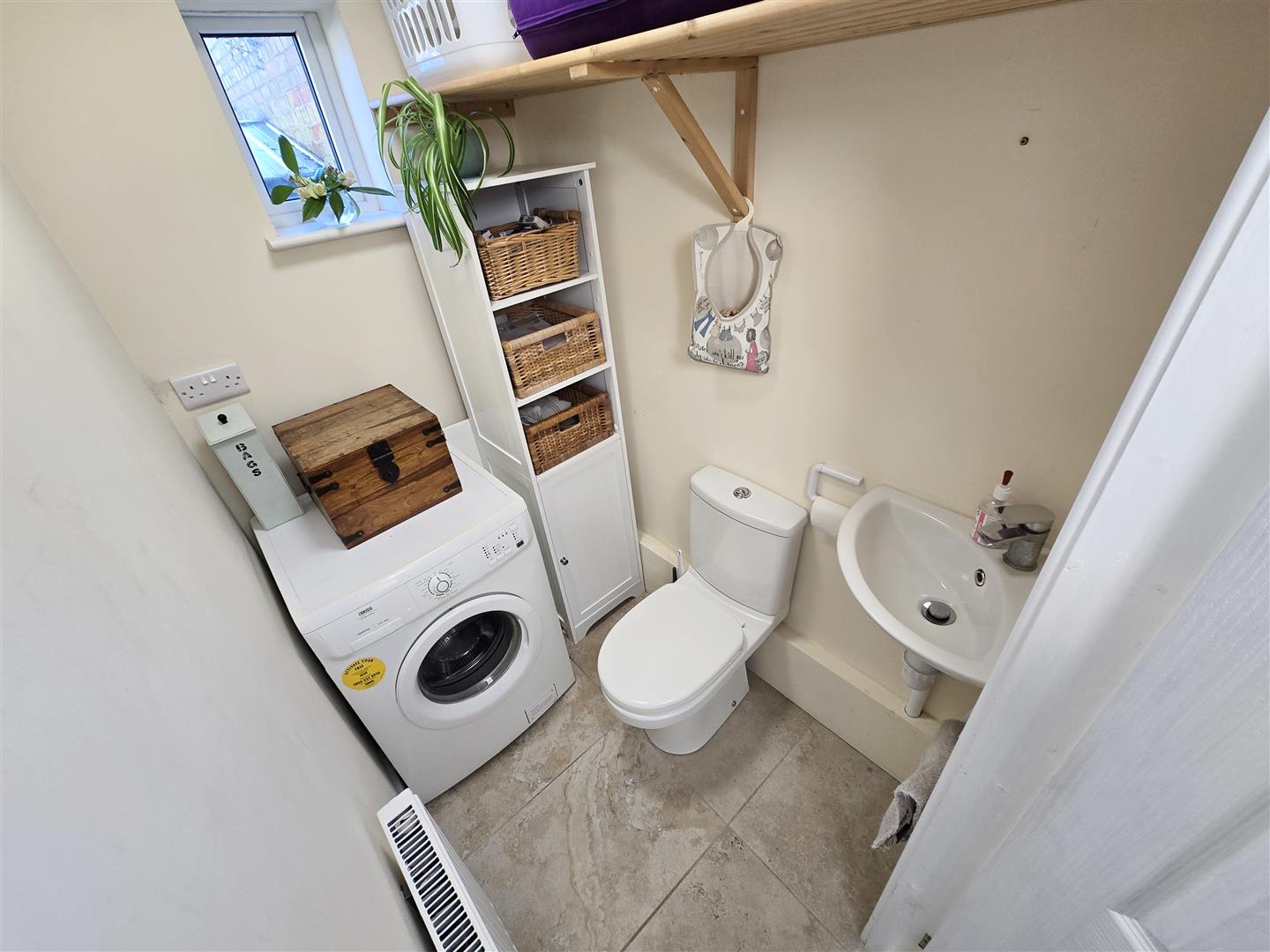 Ceiling light. uPVC double-glazed window to the side. Low-level WC. Wall-mounted hand basin. Space and plumbing for a washing machine. Radiator. Double power-point. Consumer unit. Tile flooring.