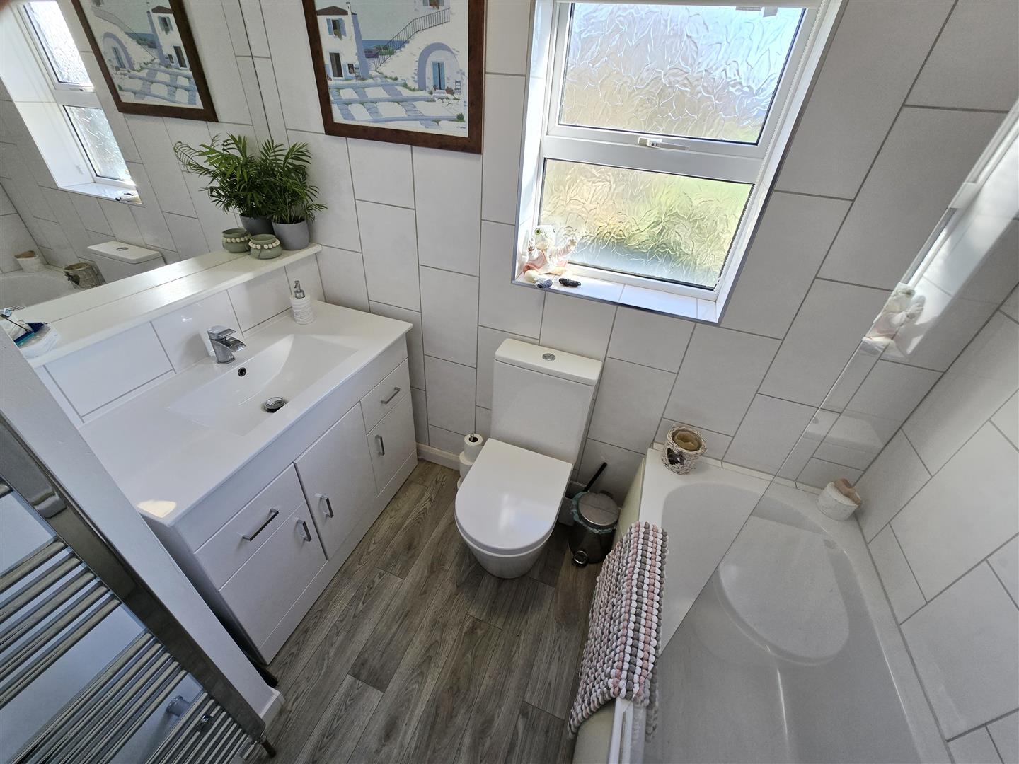 Ceiling light. uPVC double-glazed privacy window to the side. 3-piece suite comprising of a low-level WC, a vanity basin with storage cupboards and drawers, and a panelled bath with a stainless steel mixer tap and a shower-screen with a mains-fed shower over. Heated towel rail. Linoleum flooring.