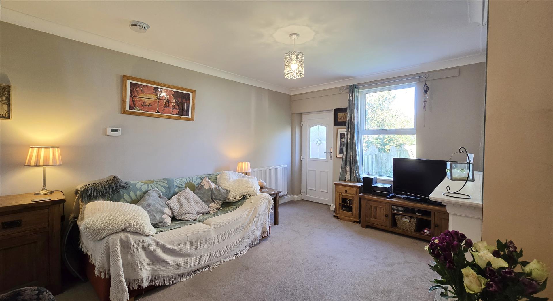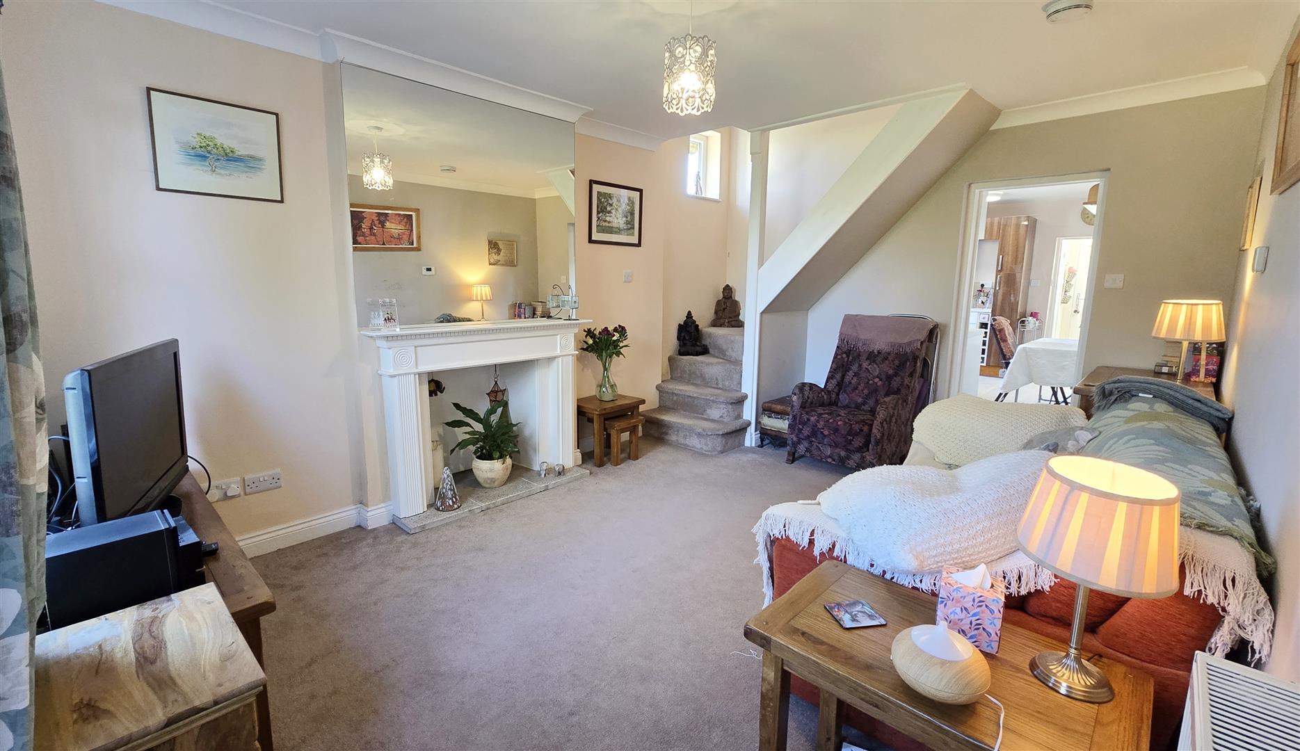 Coved ceiling. Ceiling light pendant. uPVC double-glazed privacy door to the front. uPVC double-glazed window to the front. Decorative fireplace with stone hearth and wooden mantle. Radiator. 3 x double power-points. Single power-point. Carpet flooring with stairs to the first floor.