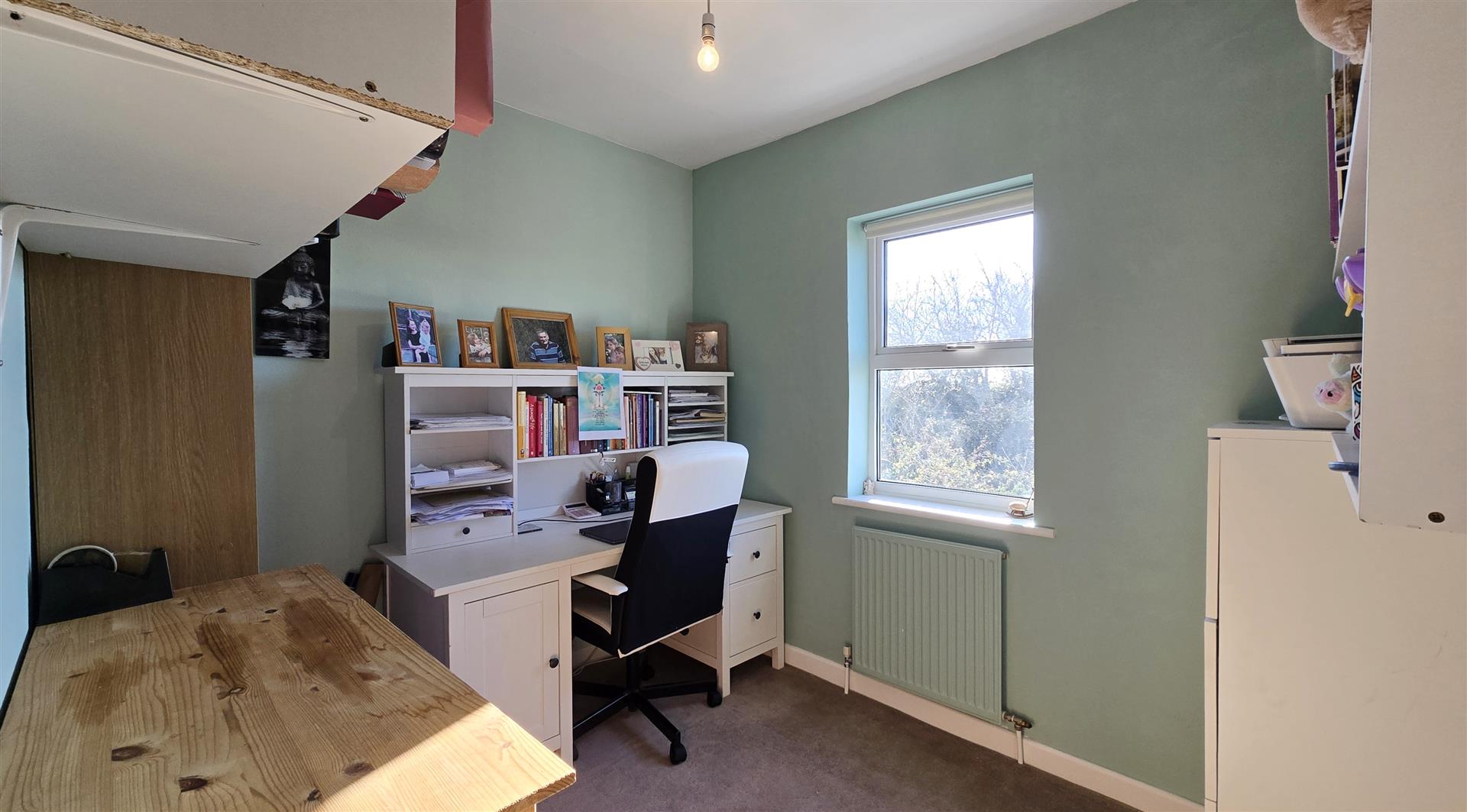 Upstairs, off the landing is a large king-size bedroom with a built-in storage cupboard, a second good-sized single bedroom, utilised by the current owner as a home office, and a family bathroom with a shower over the bath.