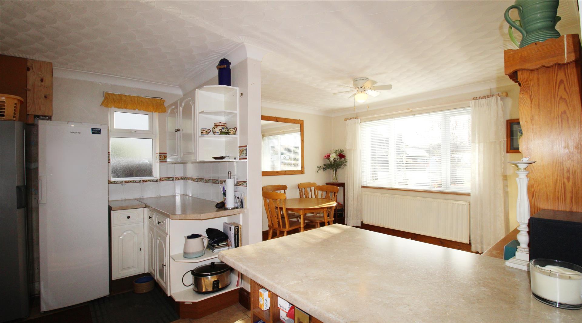 Cove and textured ceiling. Double aspect uPVC double-glazed windows to rear and side. Wall and base units. Tiled splashbacks. Ceramic 1 1/2 bowl sink and drainer with mixer tap over. Gas hob and lectric oven. Space and plumbing for dishwasher. Undercounter space for one appliance plus further space for tall fridge freezer. Power points.