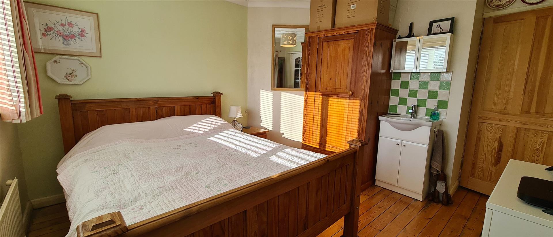 Coved and textured ceiling. uPVC double-glazed window to front. Vanity hand basin with mixer tap. Built-in single wardrobe. Power points. Radiator. Hardwood flooring.