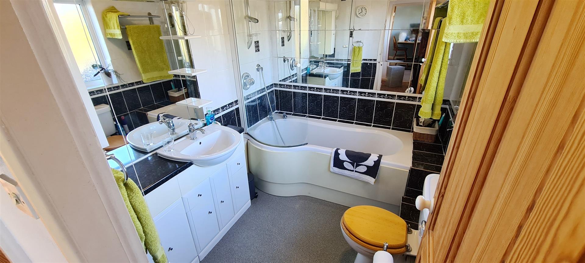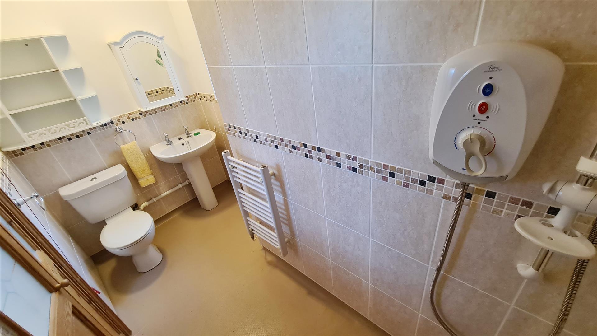 Coved ceiling. uPVC double-glazed privacy window to rear. Vanity hand basin with shaver socket. 'P' shaped bath. Low-level WC. Tiled walls.