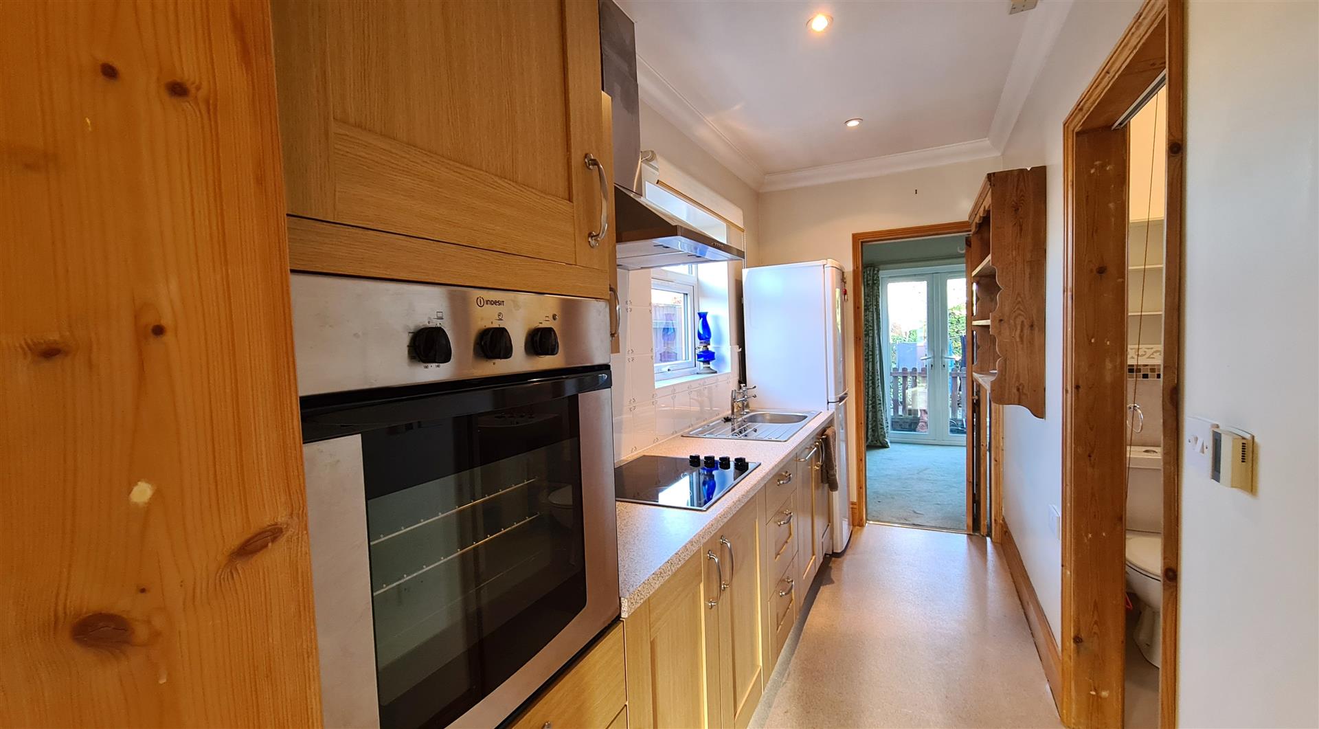 Galley-style kitchen. Coved ceiling. Inset ceiling lights. uPVC double-glazed window to side. Modern wall and base units with pantry-style storage cupboard. Stainless steel sink and drainer. ‘Indesit’ eye-level oven. Electric hob. Space for tall fridge freezer. Loft access.