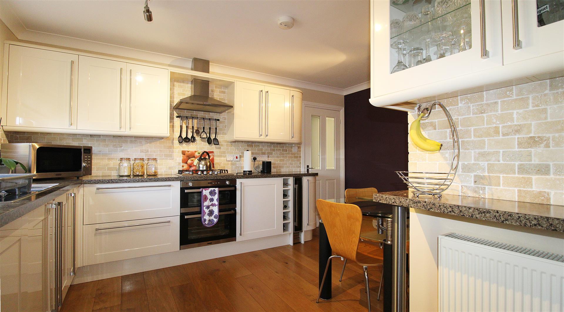 Coved ceiling. uPVC double-glazed window to front. Wall and base units with drawer storage. 'Lamona' gas hob. Double oven and grill. Stainless steel sink and drainer with mxier tap. Cobble-stone effect tiled splashbacks. Integrated fridge. Wine storage and integrated cooler. Space for dining table. Radiator. Power points. Engineered wood flooring.