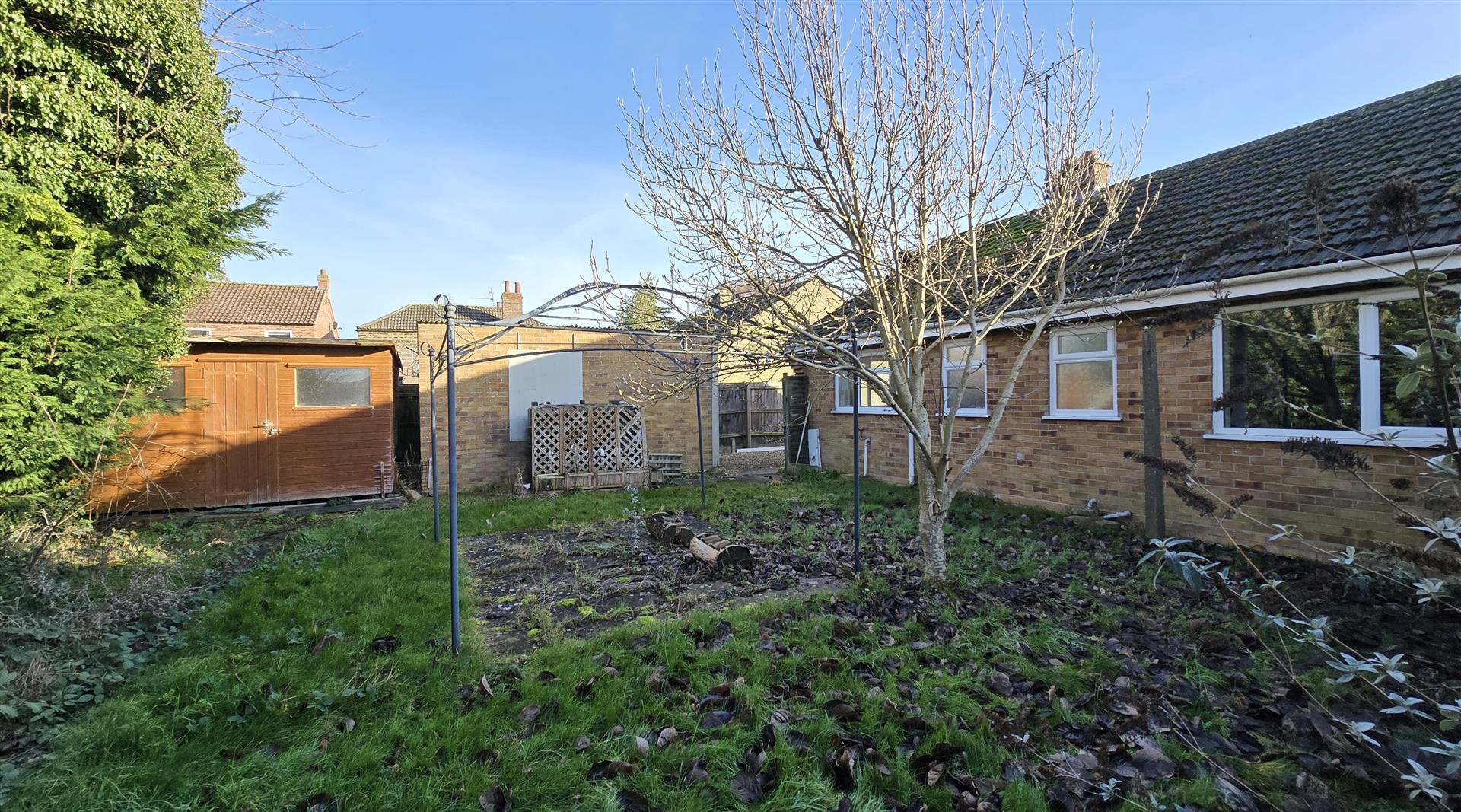To the rear is a garden laid mainly to lawn and bordered by mature trees and hedging, providing a pleasant and private outdoor space. Within the garden is a useful hobby shed with power and lighting, ideal for use as a craft room, garden studio, or workspace.