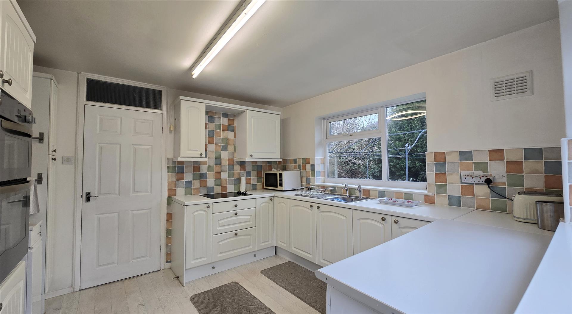 uPVC double-glazed double aspect windows to side and rear. Part uPVC part double-glazed door to side. Range of wall and base units with worktop over. Single bowl stainless steel sink. Eye-level 'Newworld' intergrated electric oven and grill. 4-ring electric hob. Space for fridge freezer. Space and plumbing for washing machine and tumble dryer. Freestanding oil boiler.