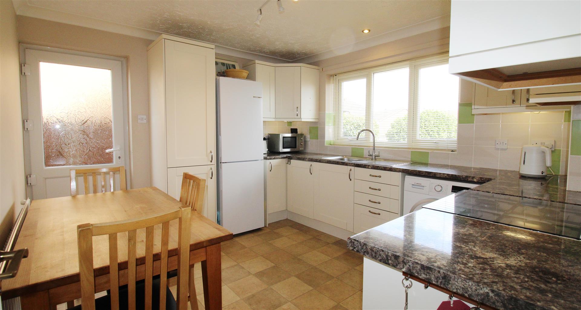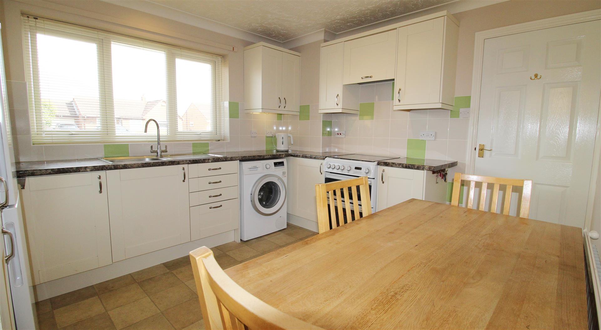 Coved and textued ceiling. uPVC double-glazed window to front. Part uPVC part double-glazed door to side. Matching wall and base units. Tiled splash backs. Stainless steel sink and drainer with mixer tap over. 'Carrick' double-oven and gas hob with extractor over. 'Bosch' washing machine. Tall fridge freezer. Power points. Radiator.