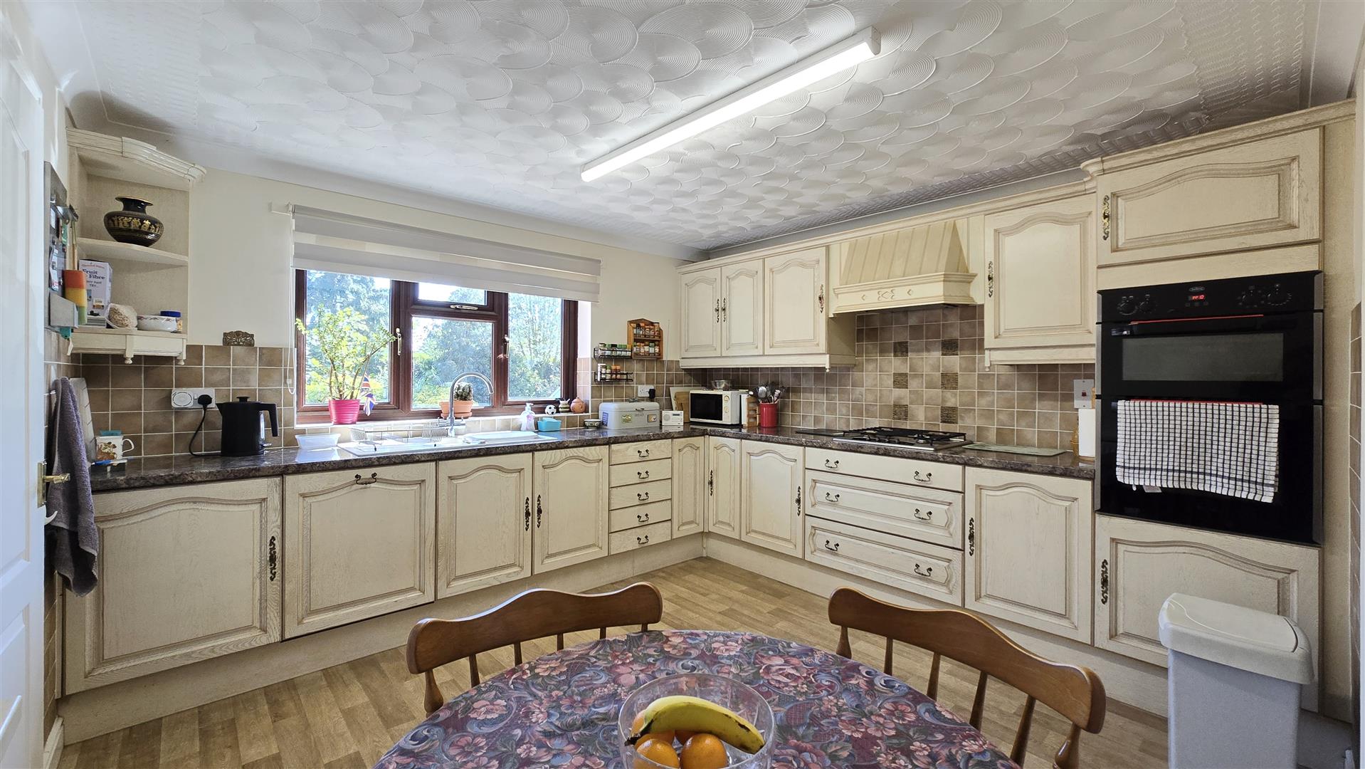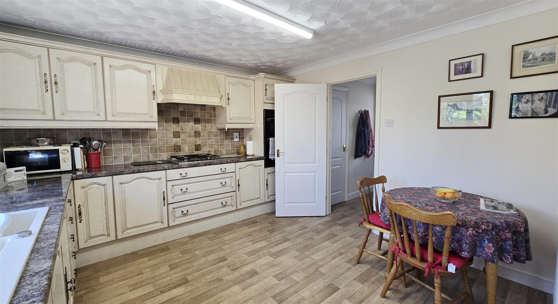 Coved and textured ceiling. uPVC double-glazed window to front. Matching wall and base units. Worktops over and drawer storage. Polycarbonate 1 1/2 bowl sink and drainer with mixer tap. Tiled splashbacks. 4-ring 'Neff' gas hob with extractor over. 'Belling' eye-level integrated oven and grill. Integrated dishwasher. Intergrated low-level fridge. Power points. Radiator. Door to utility room. Wood effect floor.