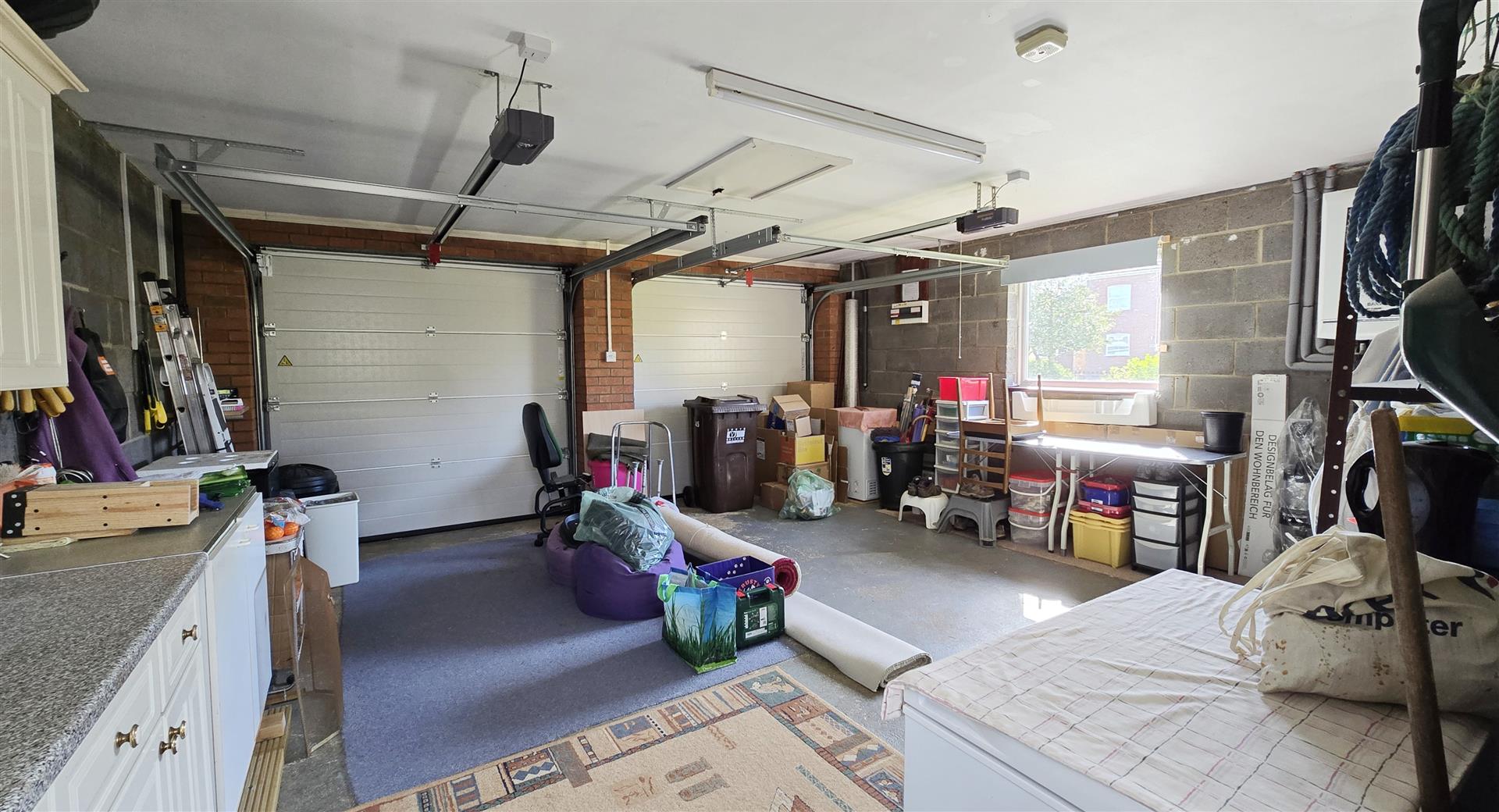 Double garage with twin electric roller doors. Part wood part patterned glass door to garden. 'Baxi' gas combi boiler serving heating and hot water. Matching wall and base units with worktop over. Stainless steel sink and drainer with cold water tap. Electric and lighting. Space for tall fridge freezer/chest freezer/tumble dryer. Outside tap, Access to loft space.