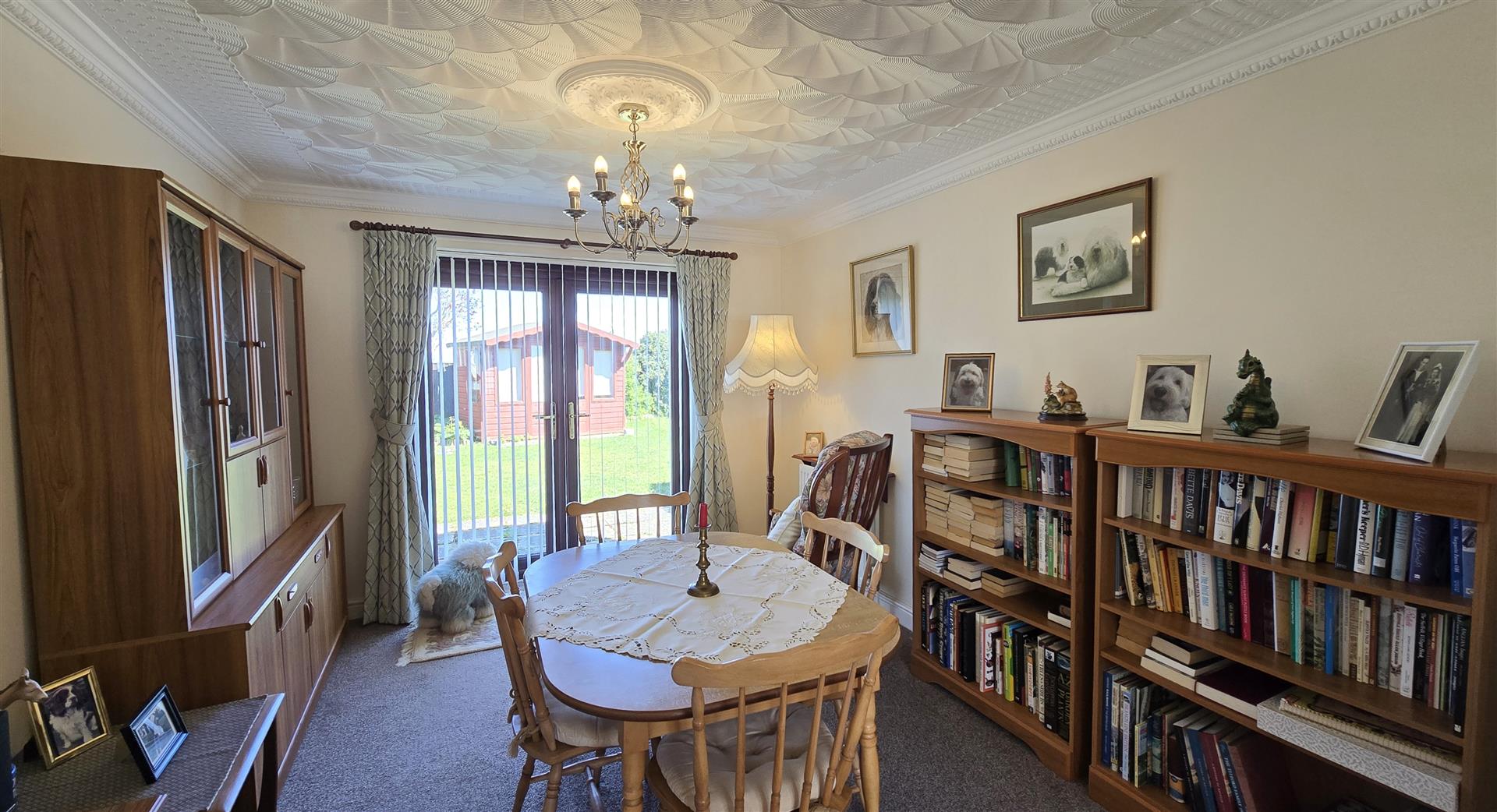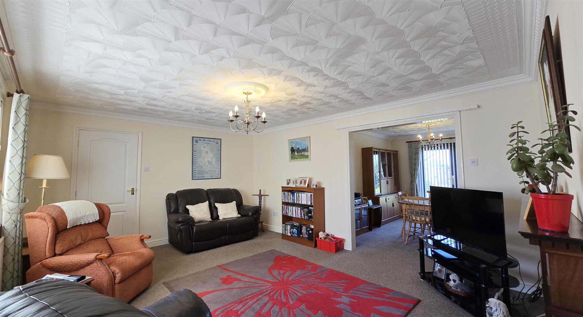 Coved and textured ceiling. Ceiling medallion. uPVC double-glazed French doors to garden. Power points. Radiator.