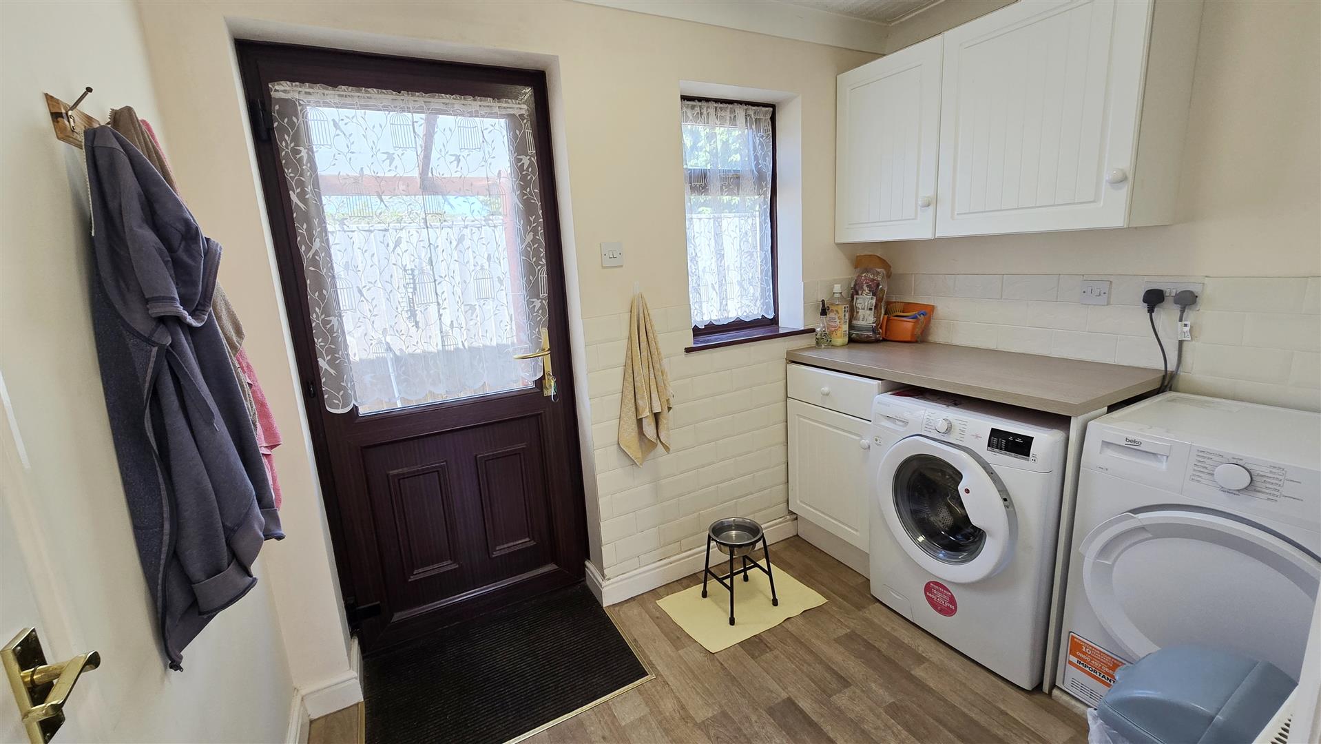 Coved and textured ceiling. Part uPVC part double-glazed door to side. uPVC double-glazed window to side. Wall and base units with worktop over. Tiled splashback. Space and plumbing for washing machine. Space for tumble dryer. Radiator. Wood effect flooring.