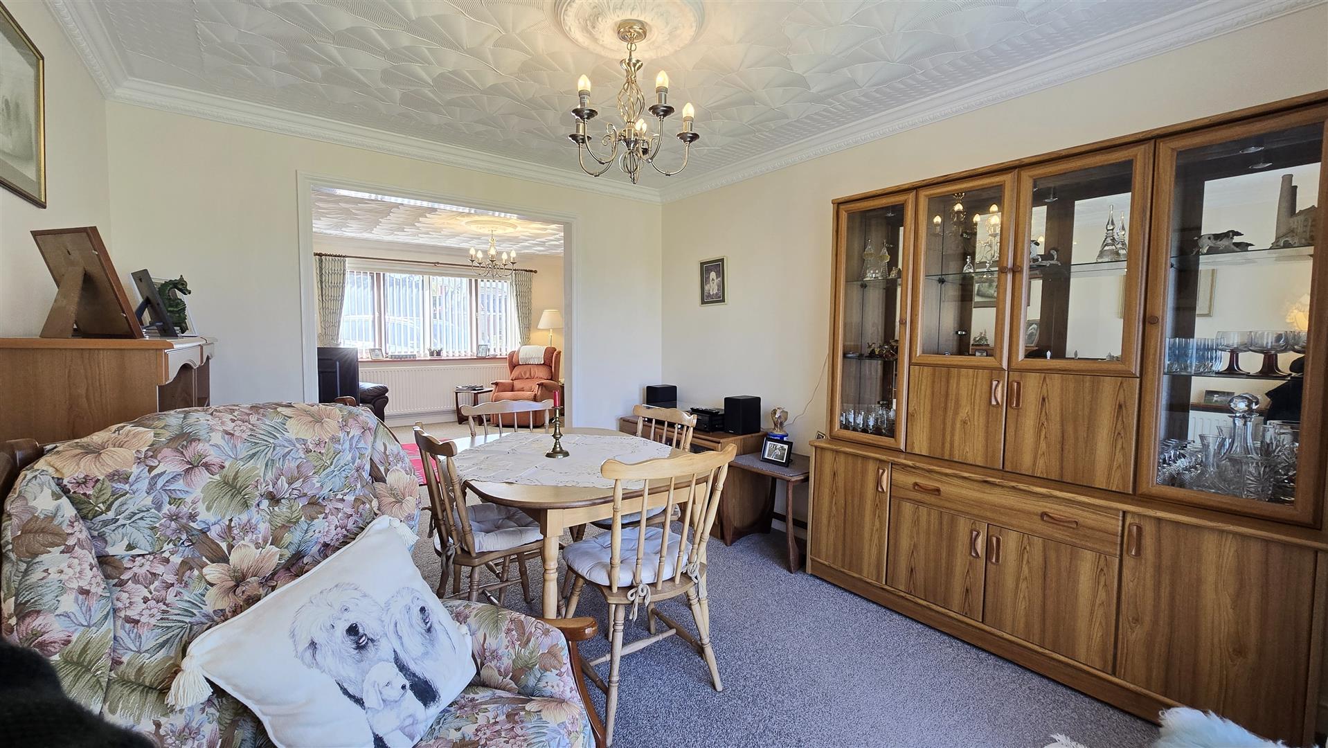 Coved and textured ceiling. Ceiling medallion. uPVC double-glazed bow window to front. Feature flame effect gas fire with decorative wooden surround. Power points. TV aerial socket. Radiator.