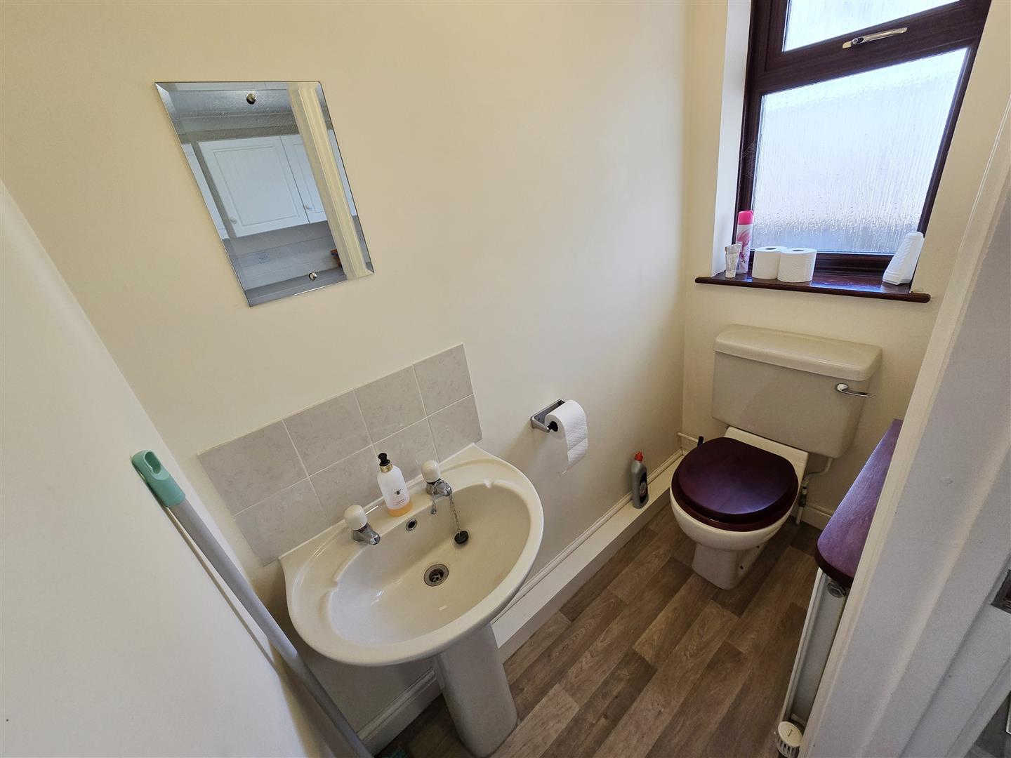 Coved and textured ceiling. uPVC double-glazed privacy window to side. Pedestal hand basin. Low-level WC. Radiator. Wood effect flooring.