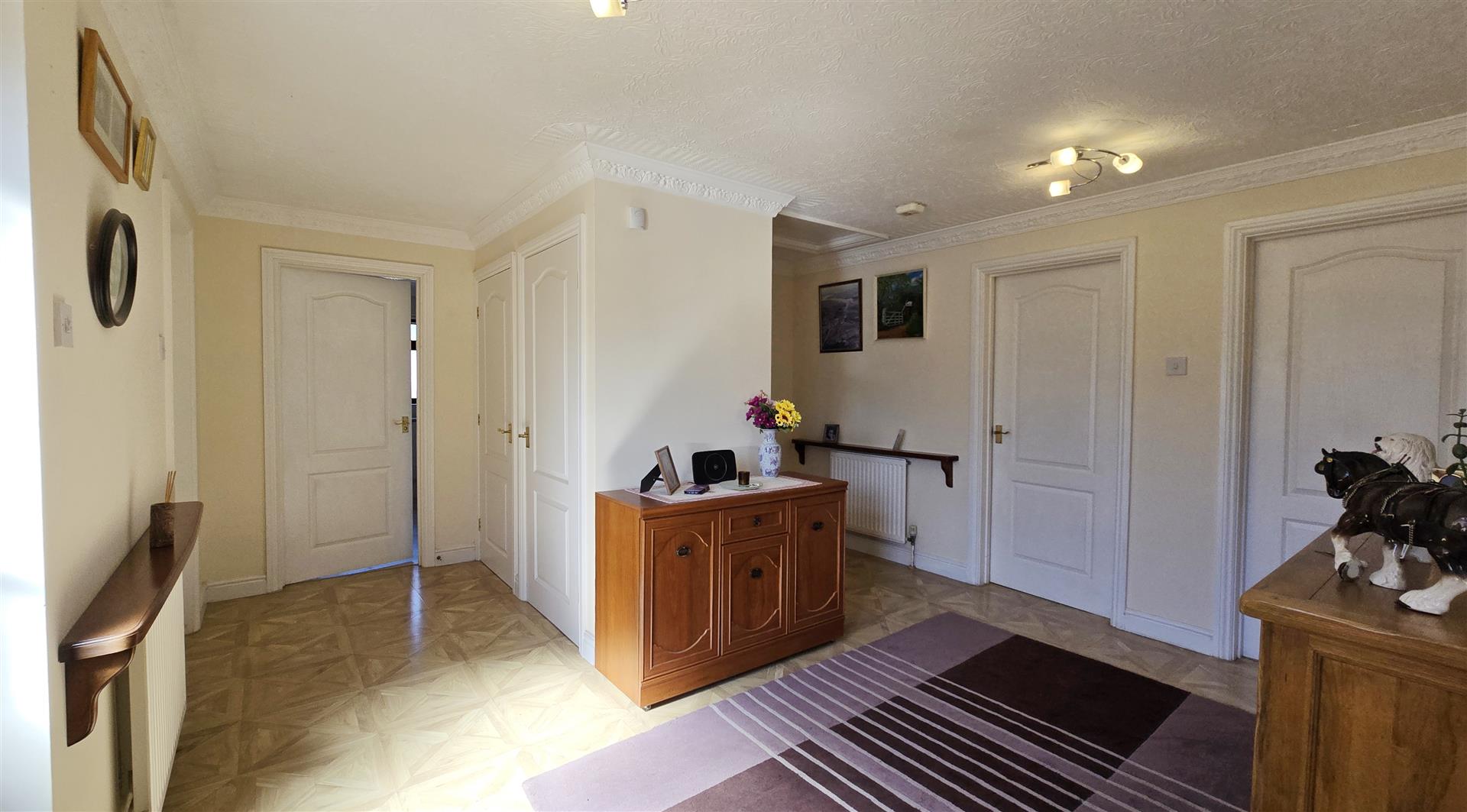 Textured and ornate coved ceiling. Part uPVC part double glazed front door with matching window panel to front. Access to cloak cupboard and linen cupboard with shelving. 2 x radiators. Double power points. Telephone point. Broadband point. Wood effect flooring.