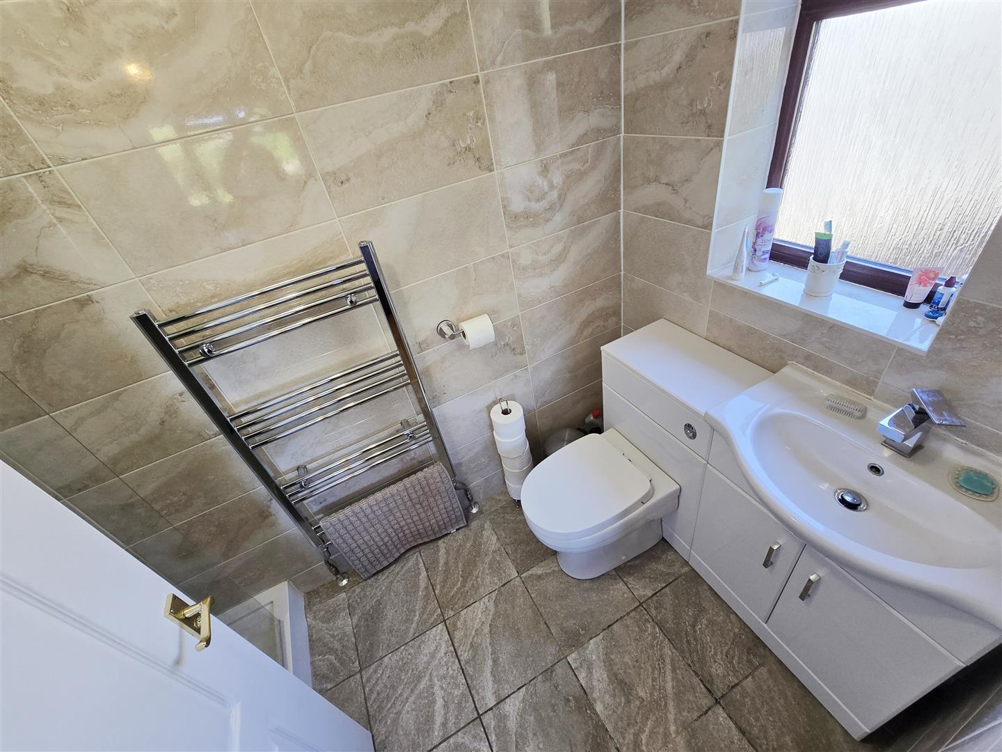 Coved and textured ceiling. uPVC double-glazed privacy glass window to side. Vanity sink and concealed cistern WC with storage. Step-in shower cubicle with mains fed shower. Heated towel rail. Extractor fan.