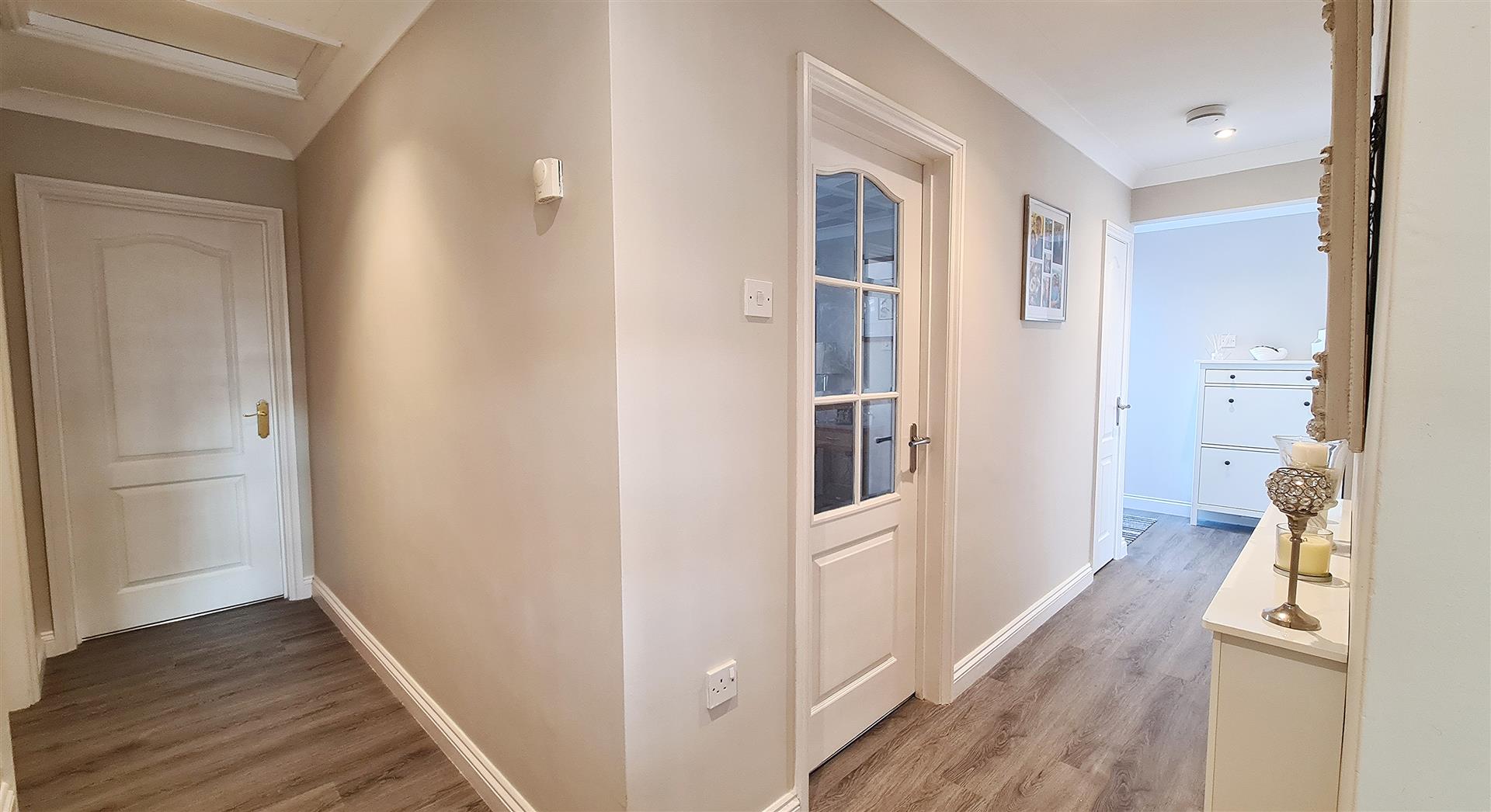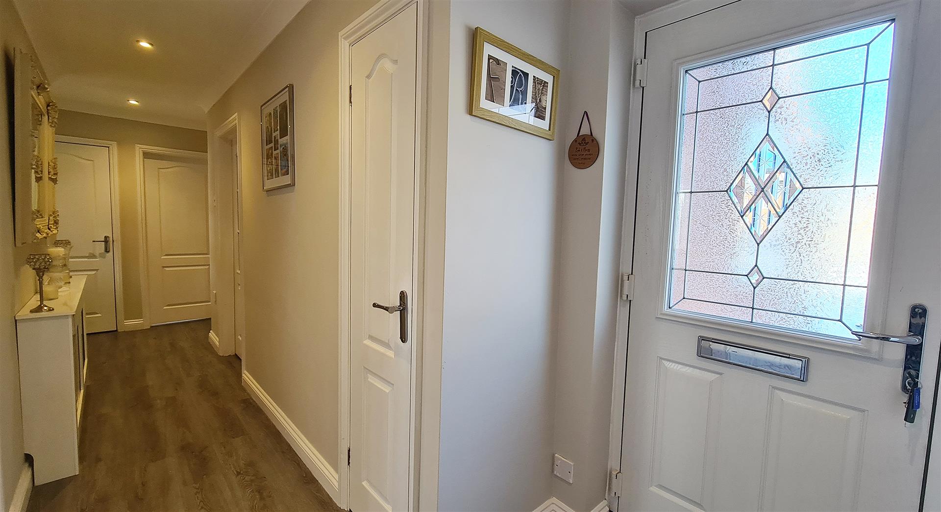 Coved ceiling. Inset ceiling lights. Part-glazed double-glazed uPVC door with a matching side panel. Small storage cupboard. Loft access hatch. Telephone socket, power points, radiator and cover. 'Karndean' flooring.
