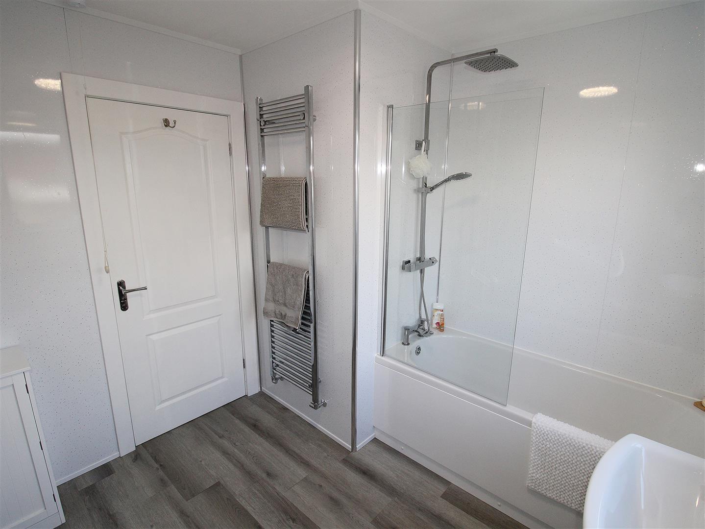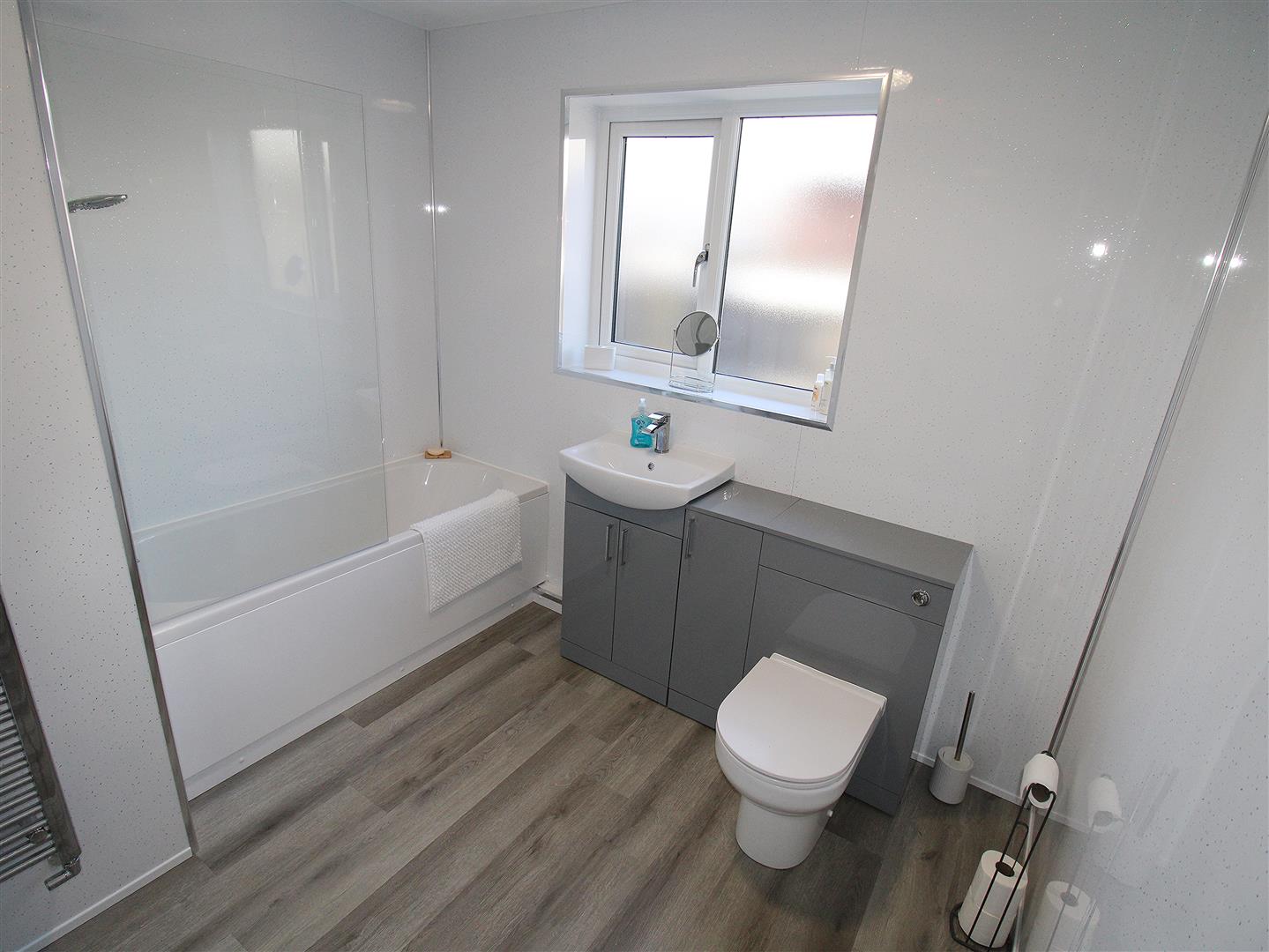 Coved ceiling. Fully panelled walls. uPVC double-glazed privacy window to side. Panelled bath with mains-fed, dual head shower over. Vanity unit with hand basin, WC and storage. Heated towel rail.