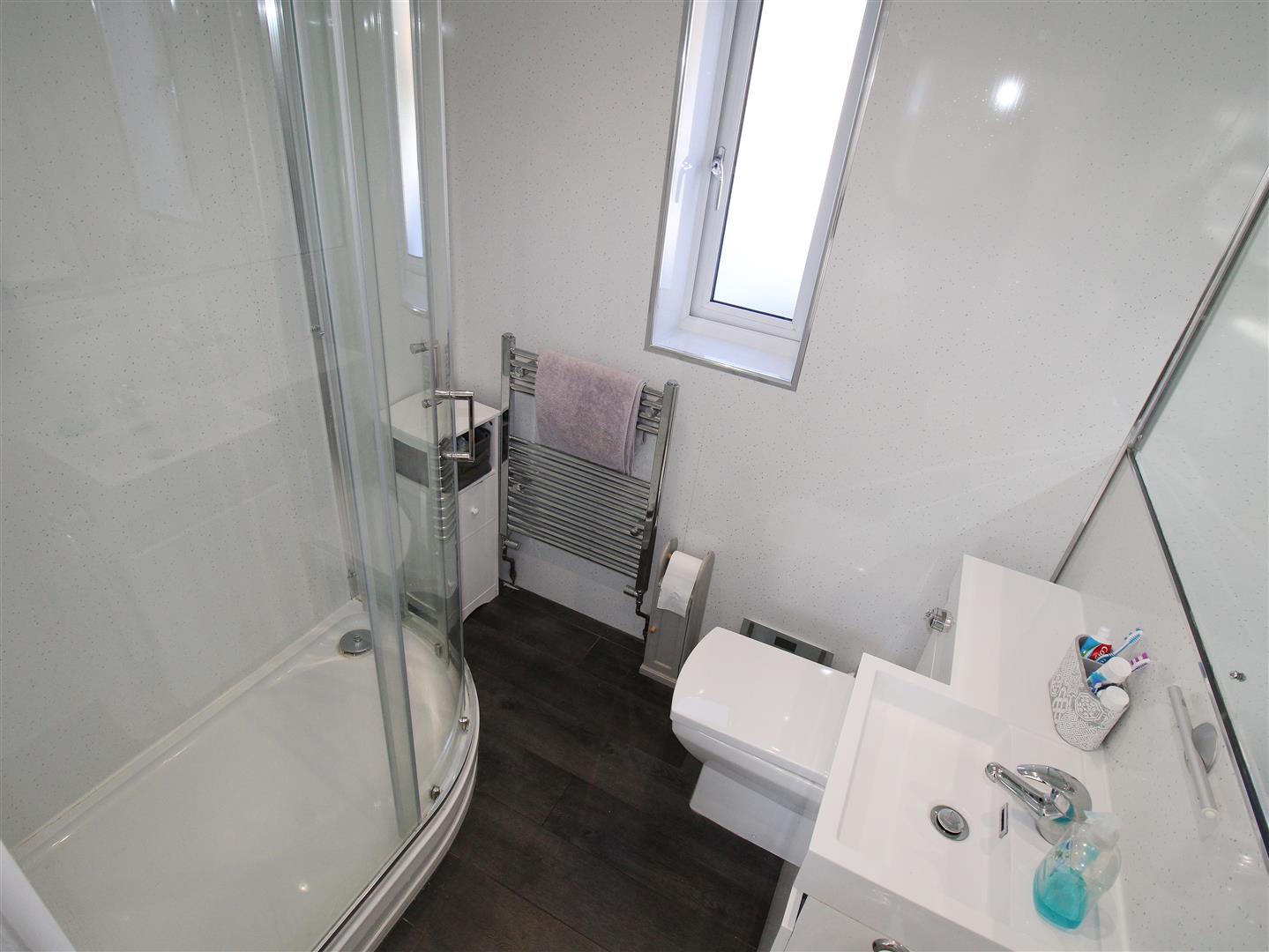 uPVC double-glazed privacy window to front. Double shower cubicle with mains-fed dual head shower. Vanity unit with hand basin, WC and storage.