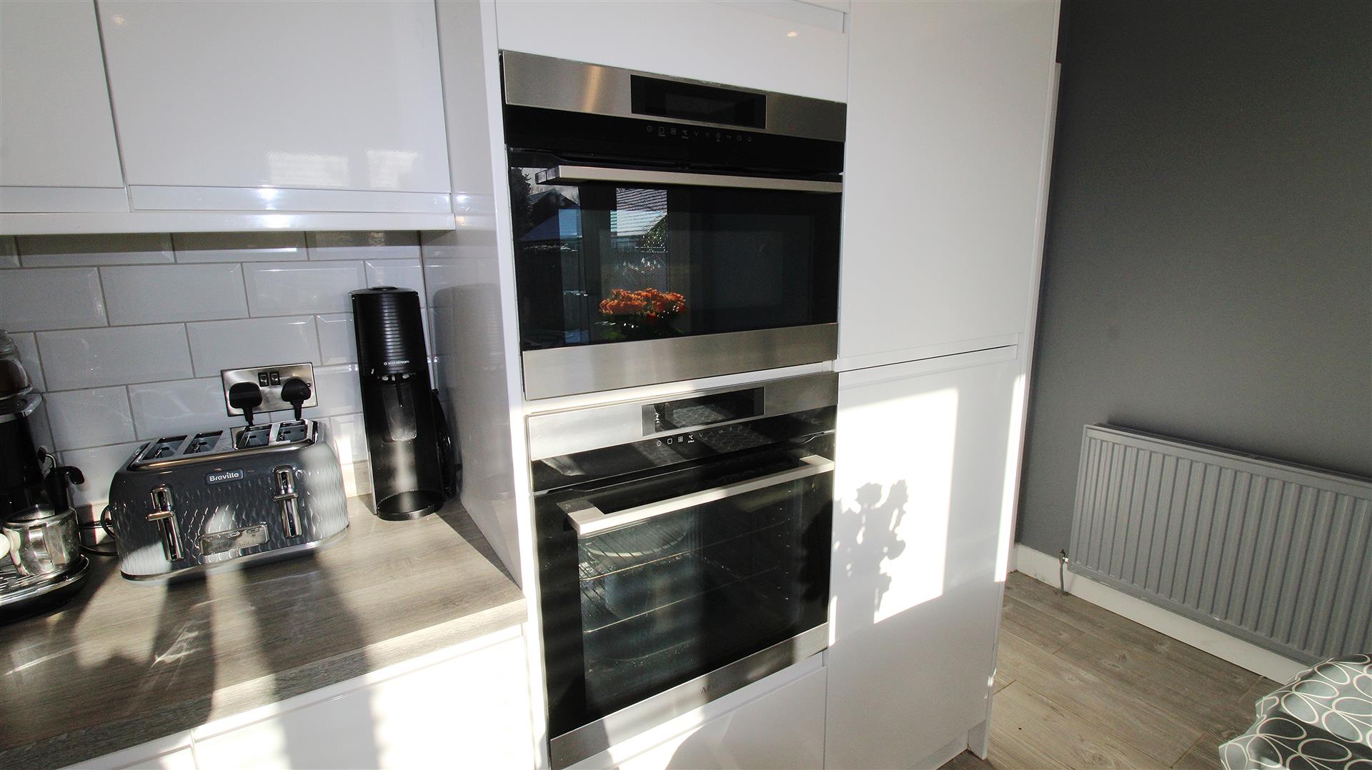 Coved ceiling with inset ceiling lights. uPVC double-glazed French doors to rear. uPVC double-glazed window to range. Range of matching wall and base units. Tiled splashbacks. Composit 1 1/2 bowl sink and drainer with mixer tap over. 'AEG' eye-level double ovens. Matching 'AEG' hob with extractor over. 'AEG' Integrated washing machine and dishwasher. Integrated fridge freezer. Space for dining table. Power points.