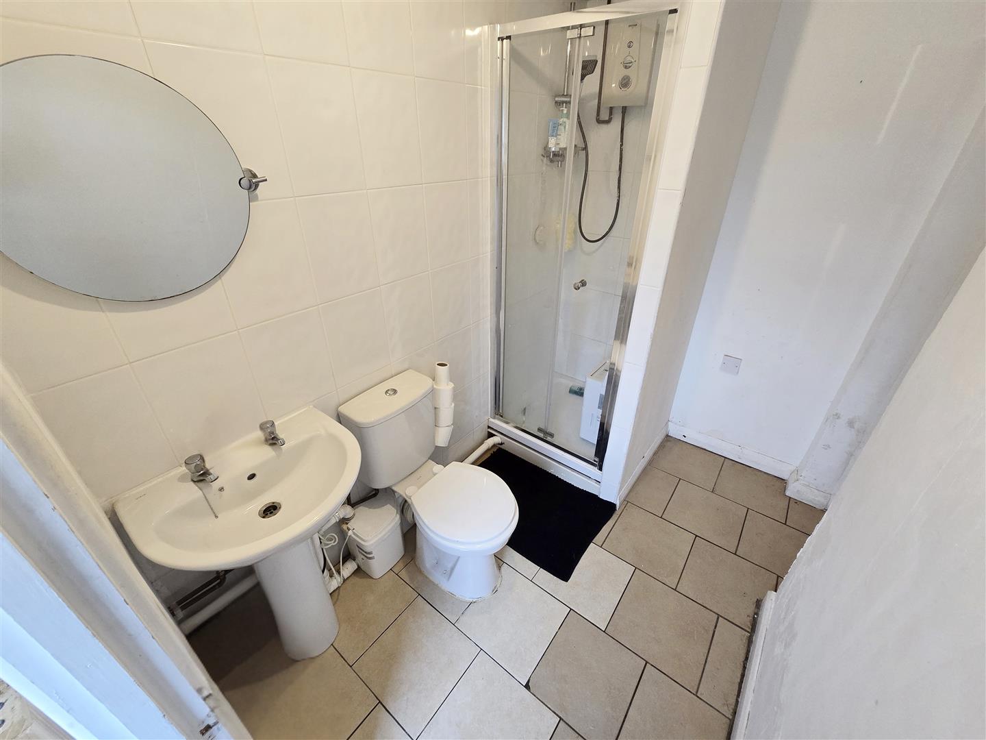 Ceiling light. 3-piece suite comprising of a low-level WC, a pedestal hand basin and a shower cubicle with a 'Bristan' electric shower. Tiled splashbacks. Tiled flooring.