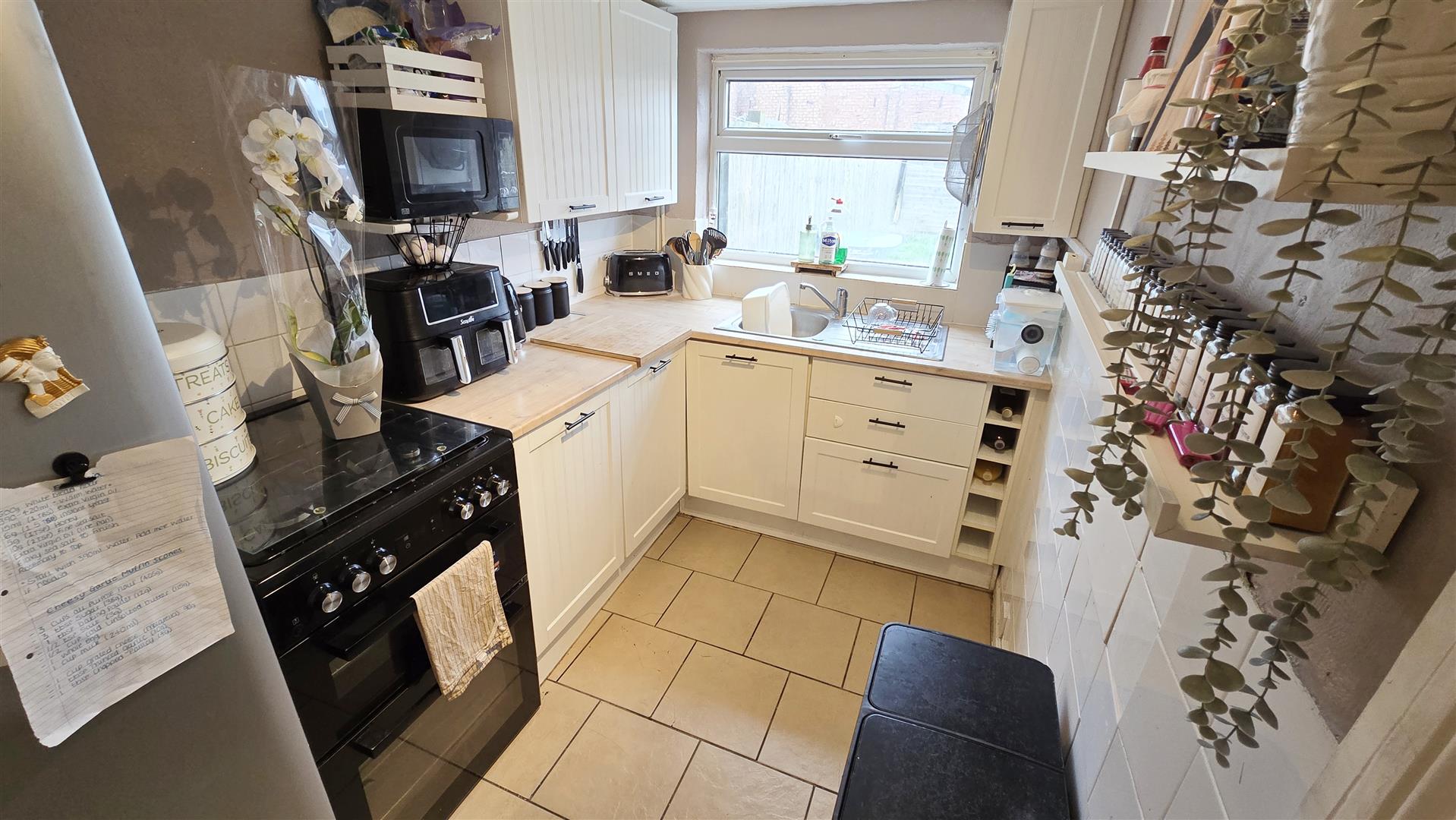 Textured ceiling. Ceiling light. uPVC double-glazed window to the rear. Fitted range of matching wall and base units with a worktop over and a tiled splashback. Stainless steel sink and drainer with a stainless steel mixer tap. Freestanding 'Beko' oven and grill with a 4-burner gas hob. Space for an American-style fridge-freezer. 3 x double power-points. Tiled flooring.