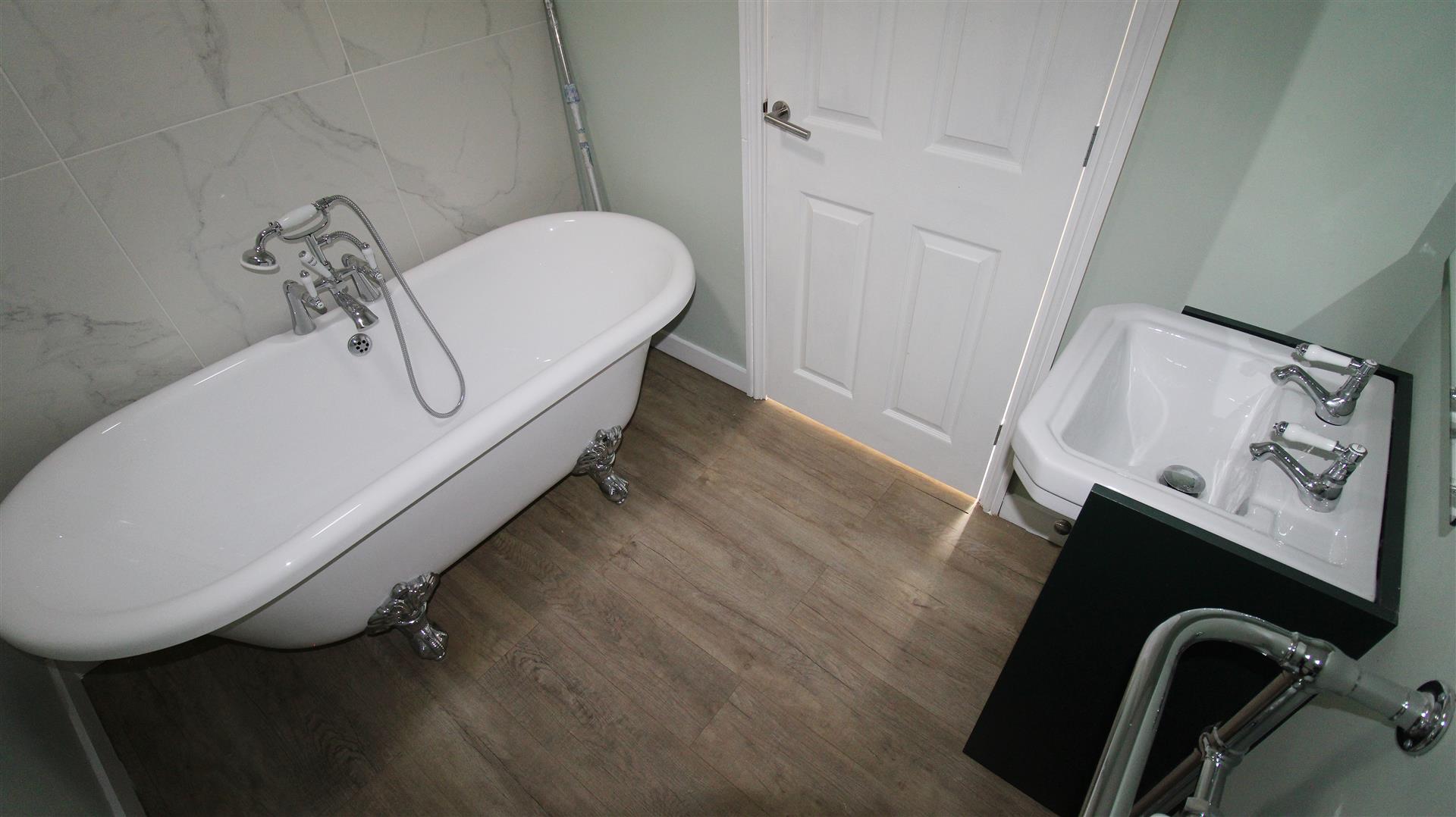 Inset ceiling lights. Claw bath tub with mixer tap and shower head attached. Vanity hand basin. Low-level WC. Radiator. Tiled wall.
