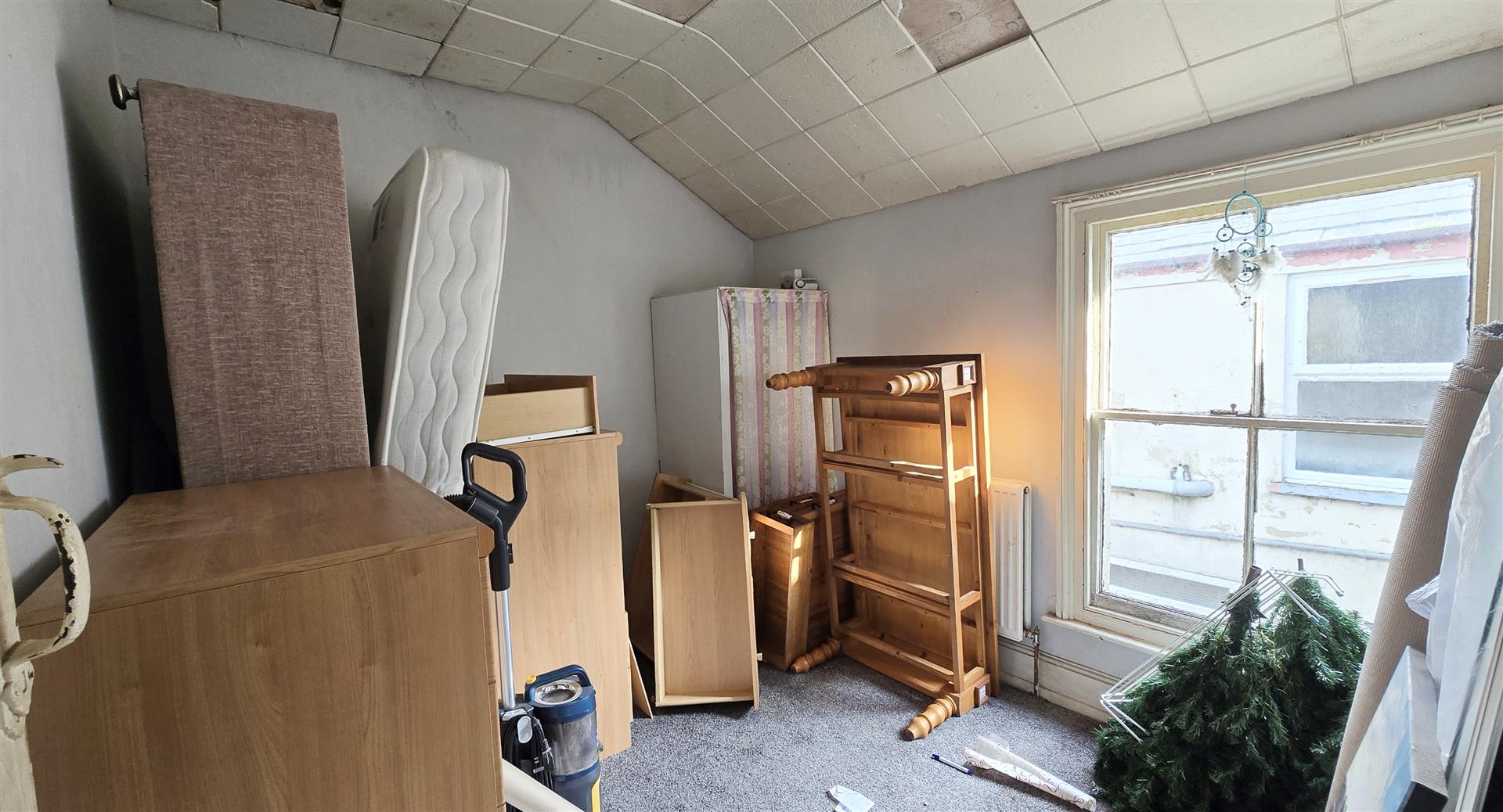 2 x light pendants. Loft hatch. Wooden-framed single-glazed sash window to the side. Radiator. Double power-point. Partially carpeted flooring.