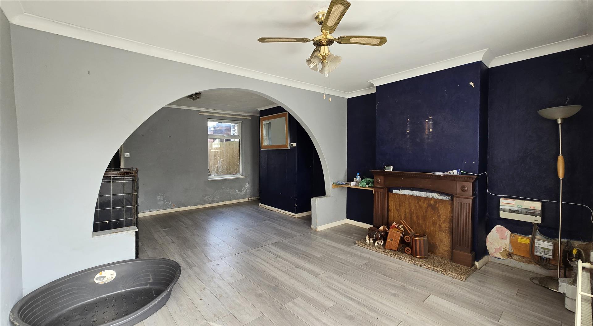 Coved ceiling. Fan light. uPVC double-glazed window to the front. Wooden door with privacy window to the front. Radiator. Consumer unit. Double power-point. BT point. Laminate flooring. Wide opening to dining room.