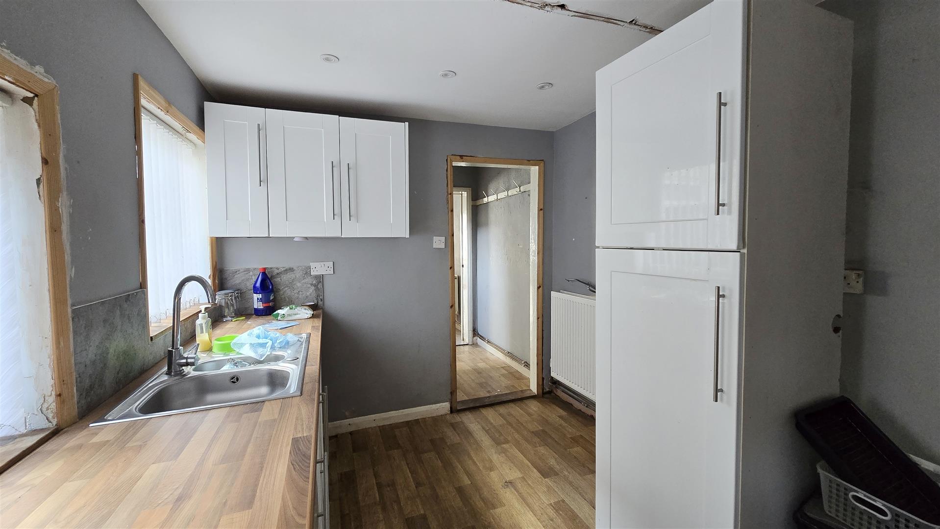 Inset ceiling lights. 2 x uPVC double-glazed windows to the side. Fitted base units comprising cupboards and drawers with a worktop over and a tiled splashback. 1 and 1/2 bowl stainless steel sink and drainer with a stainless steel mixer tap. Matching wall unit and tall larder cupboard. Radiator. 2 x double power-points. Single power-point. Linoleum flooring.
