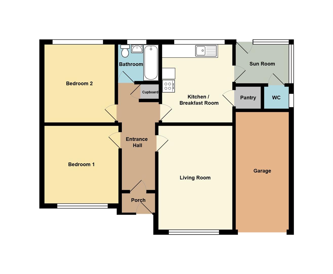 The bungalow boasts spacious accommodation throughout, including a comfortable living room, a kitchen/breakfast room with a walk-in pantry and a light-filled sun room. The bungalow also offers a king-sized master bedroom with freestanding wardrobes, a second generous double bedroom. There is a family bathroom with a shower over the bath and the convenience of an additional cloakroom.