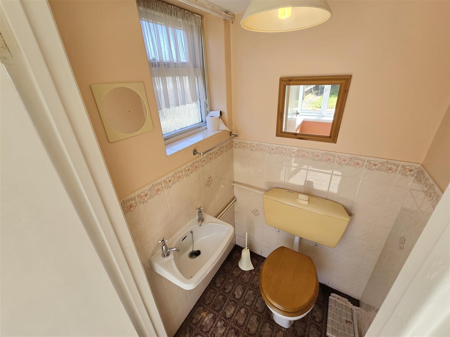 Ceiling light pendant. Wooden-framed privacy window to the side. 2-piece suite comprising of a low-level WC and a wall-mounted hand basin. Part-tiled walls. Carpet flooring.