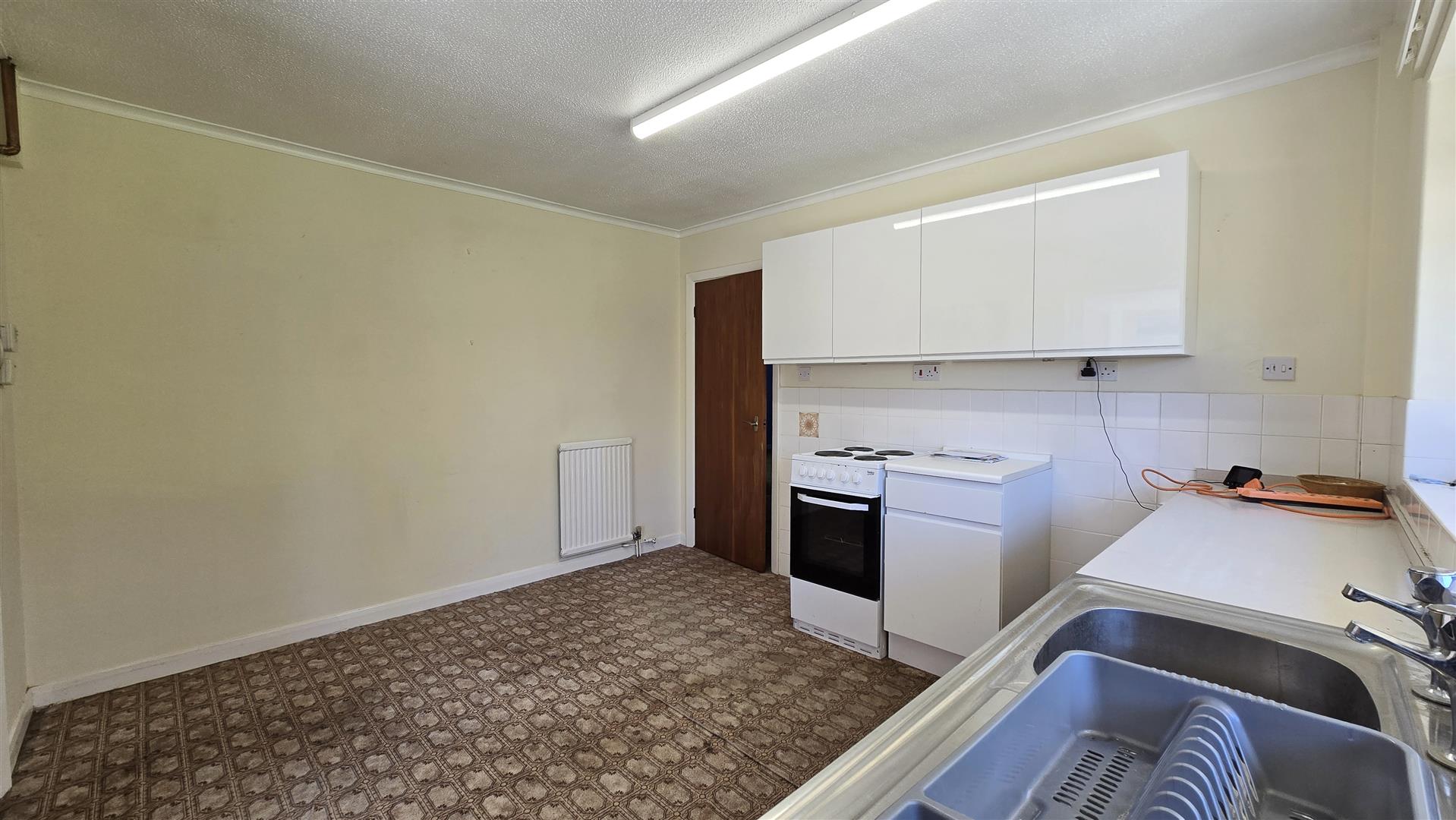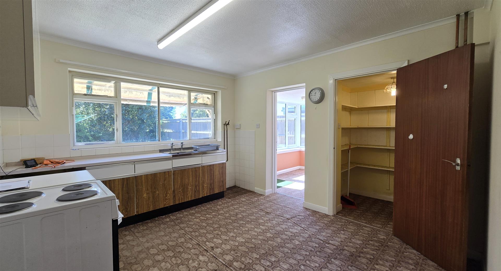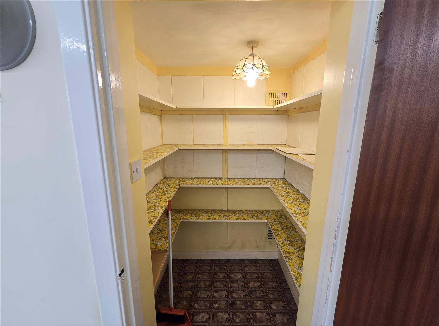 Coved and textured ceiling. Strip light. Wooden-framed window with secondary double glazing to the rear. Fitted base units comprising cupboards with drawers with a worktop over and a tiled splash back. Stainless steel sink and drainer with twin taps. Additional wall units. Freestanding 'Beko' oven with electric hob. Space and plumbing for a top loading washing machine. Walk-in pantry measuring approximately 1.26m x 1.00m with an internal light. single power-point and shelving. Radiator. 2 x double power-points. Single power-point. Carpet flooring.