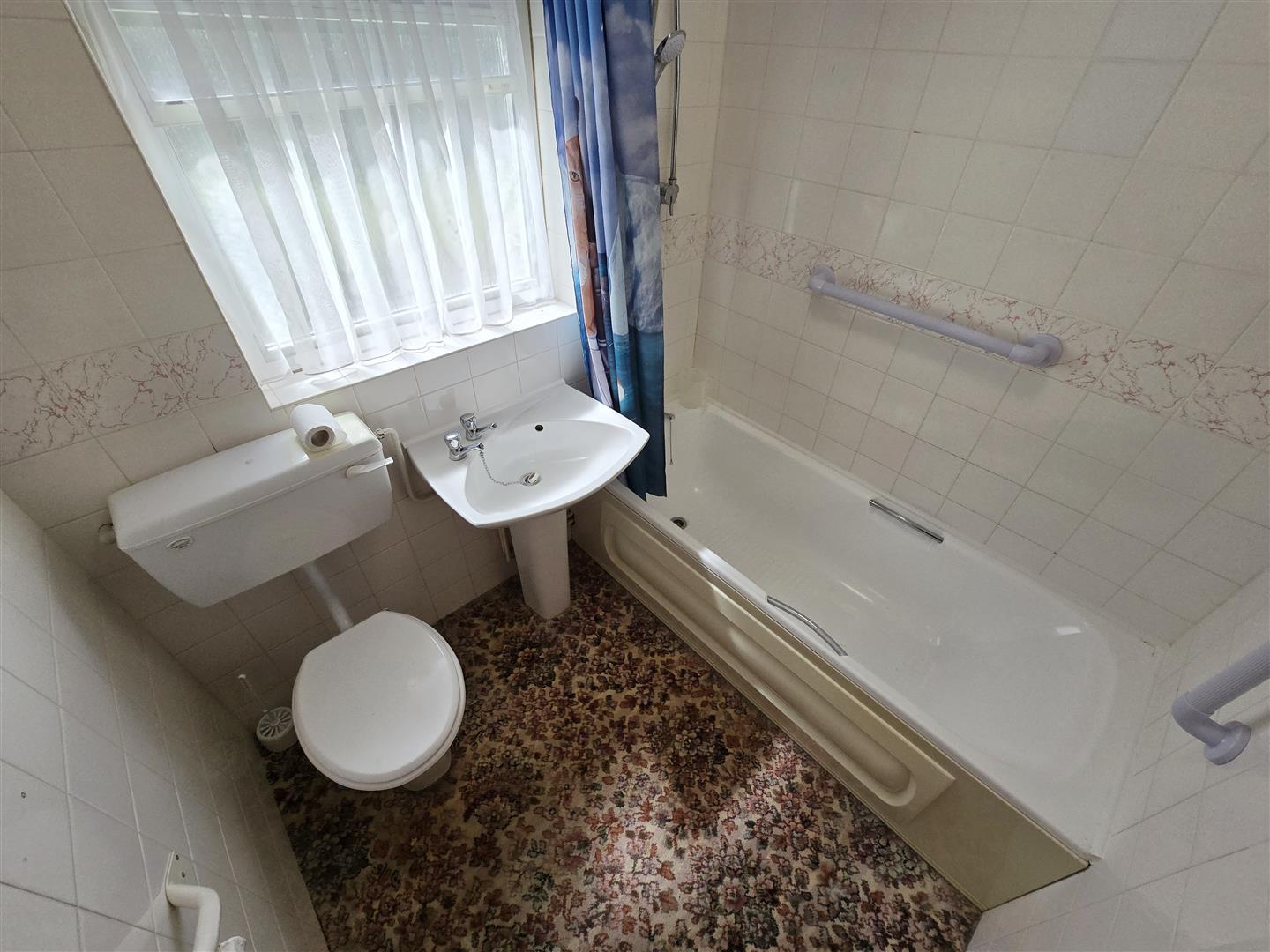 Coved and textured ceiling. Ceiling light. Wooden-framed privacy window with secondary glazing to the rear. 3-piece suite comprising of a mid-level WC, a pedestal hand basin and a panelled bath with twin taps and a mains-fed 'Bristan' shower over. Fully-tiled walls. Wall-hung mirrored vanity cupboard. Carpet flooring.