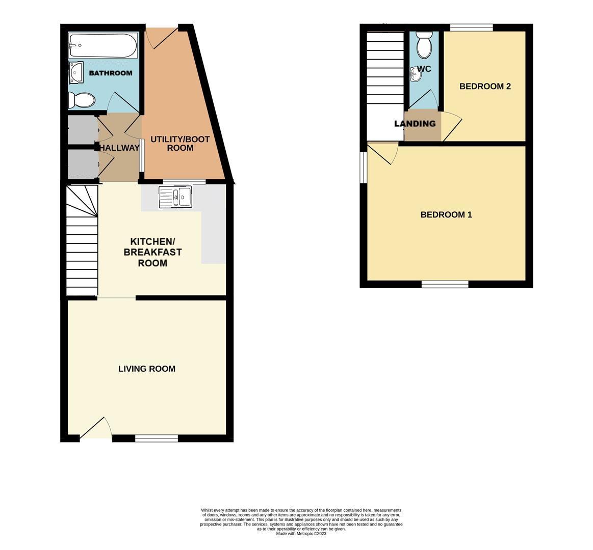 Downstairs, the property comprises a cosy living room, a kitchen/breakfast room with a convenient separate utility/boot room, as well as a family bathroom with a shower over the bath. Upstairs, you will find the light-and-bright master bedroom, a further good-sized single bedroom, and a cloakroom.