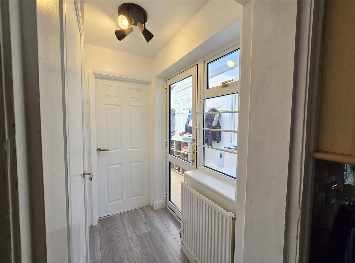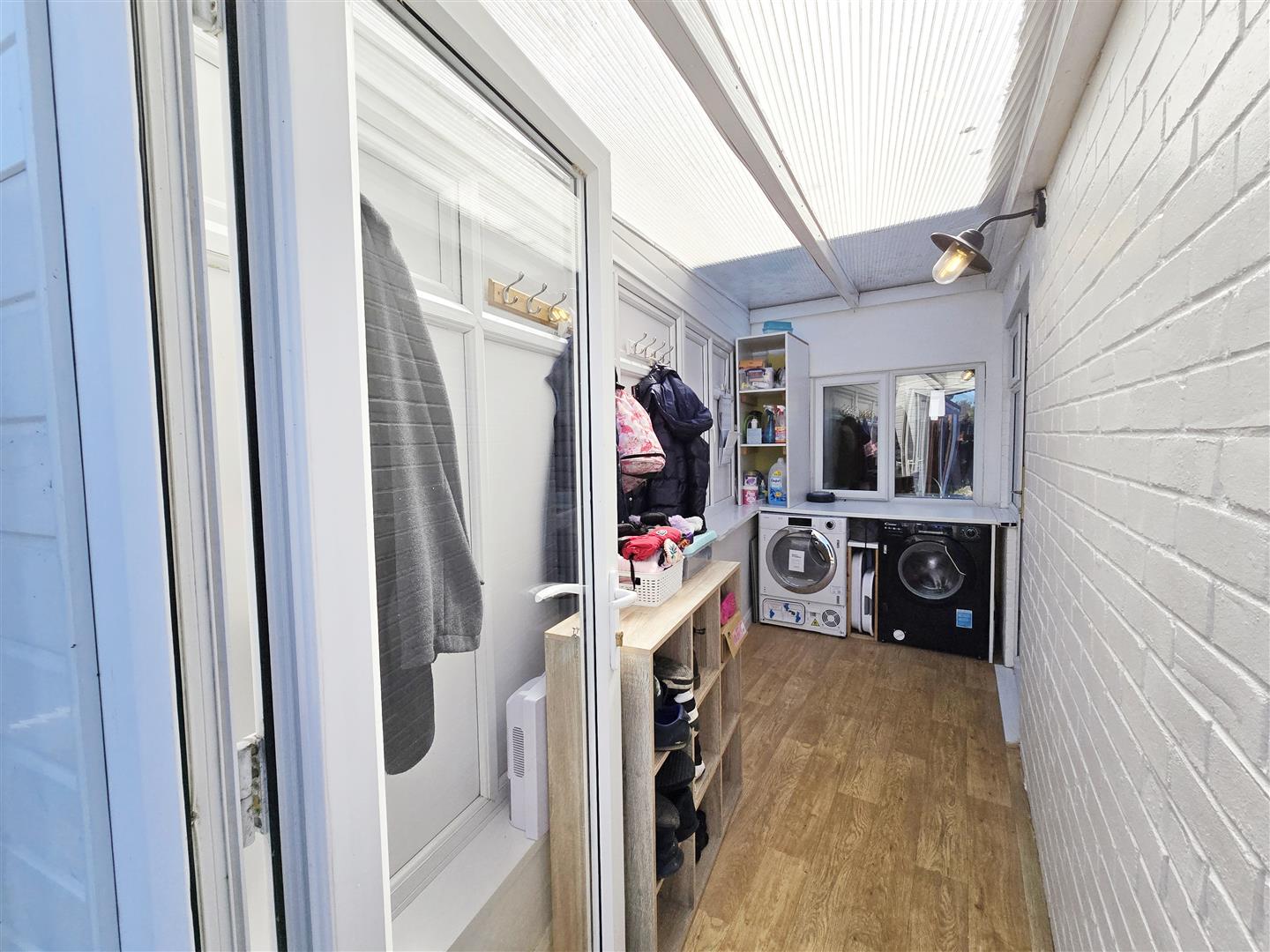 Polycarbonate roof. Solid uPVC window panels to the side. uPVC double-glazed door to the garden. Space and plumbing for a washing machine. Power points. LVT flooring.