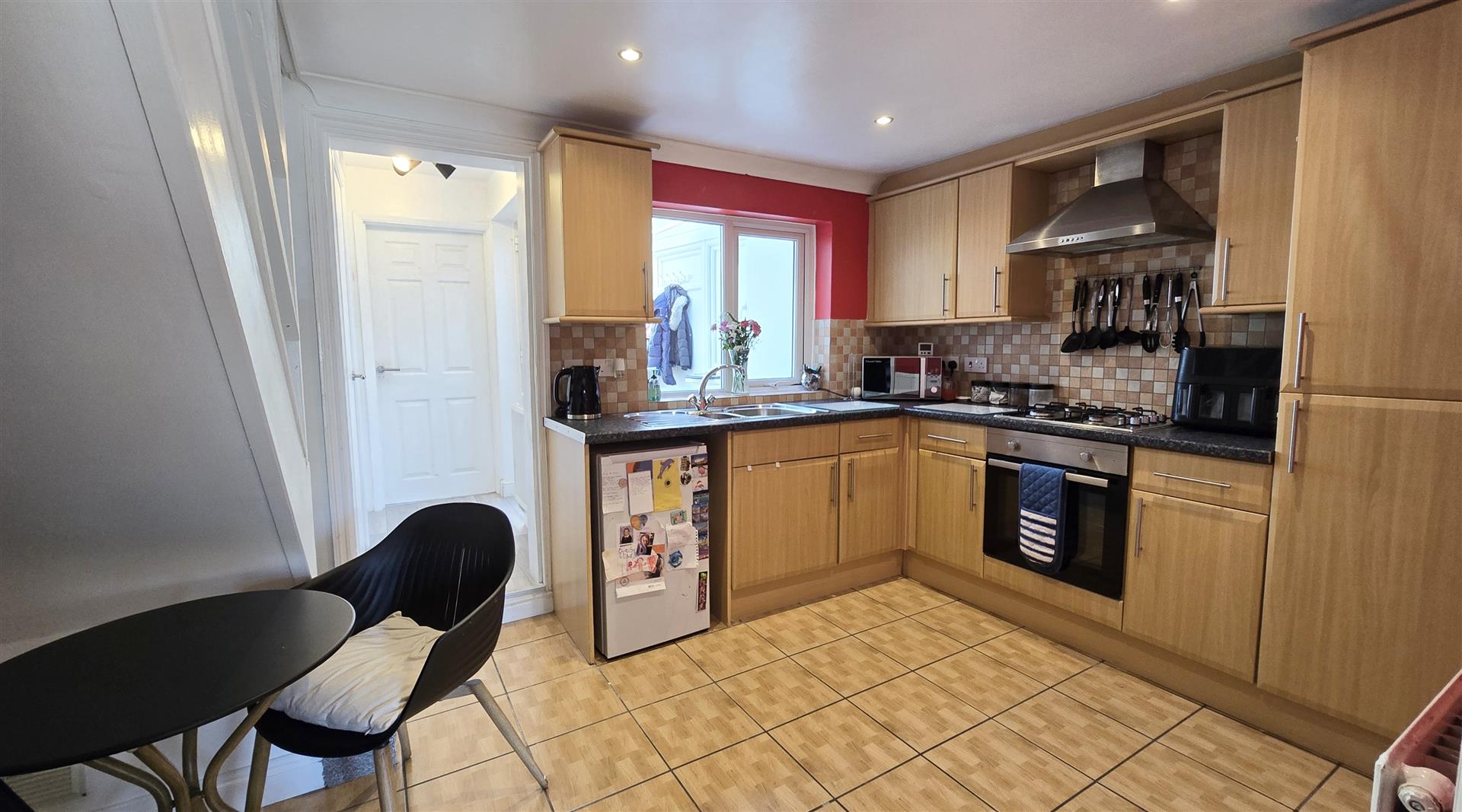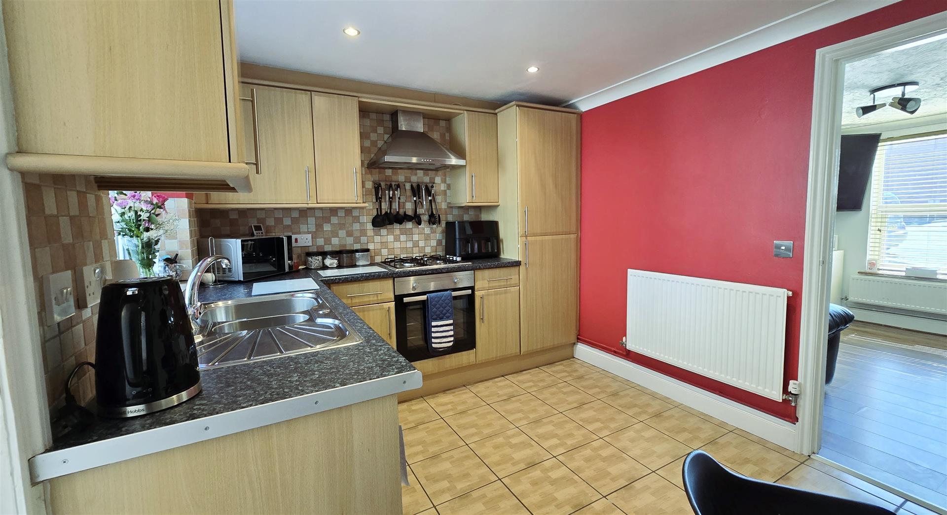 Coved ceiling. Inset ceiling lights. uPVC double-glazed window to the Utility/Boot Room. Wall and base units with worktop over. Stainless steel 1 and 1/2 bowl sink and drainer with mixer tap. 'Beko' oven and gas hob with extractor fan over. Integrated fridge-freezer. Space for 1 x under-counter appliance. Power-points. Radiator. Tile flooring. Stairs to first floor.