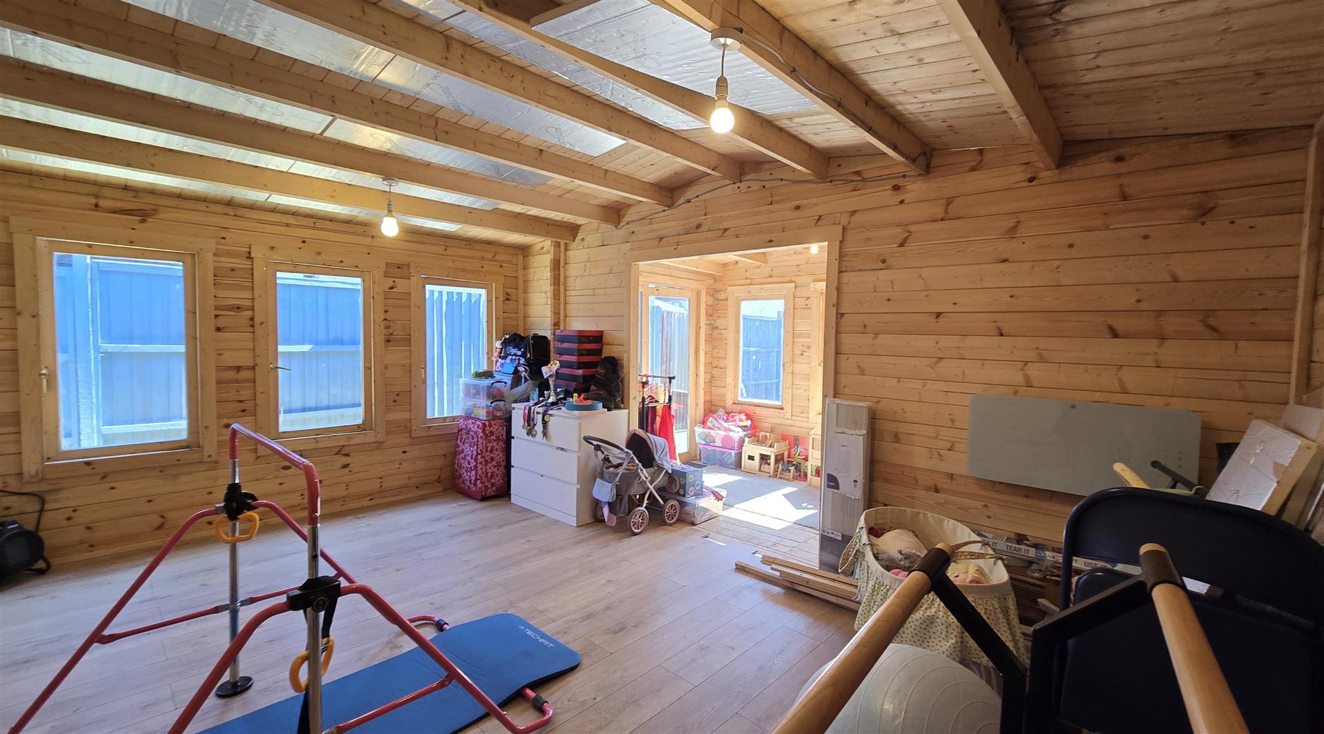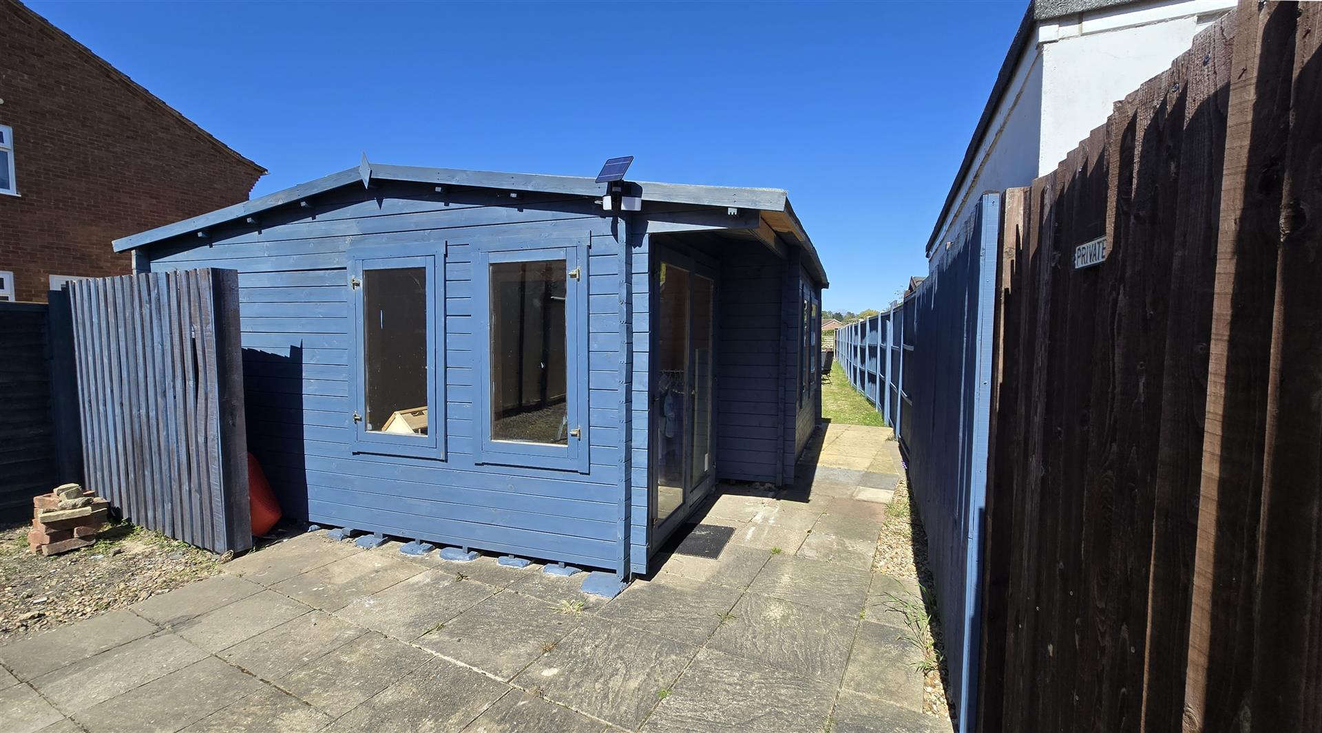 To the front of the property is a gravelled driveway, providing off-road parking for 1 vehicle. A pedestrian gate provides access to the rear garden. The garden is mostly laid to lawn, with a footpath leading to a wooden storage shed, beyond which are field views. There is a large patio on which to position outdoor furniture. The garden boasts a super-sized wooden cabin (details below), and benefits from an outdoor tap and lighting.