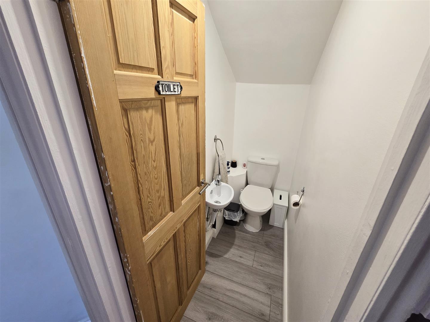 uPVC double-glazed privacy window to the rear. 3-piece suite comprising a low-level WC, a pedestal hand basin and a panelled bath with a mixer tap with a shower over. Part-tiled walls. Radiator. LVT flooring.