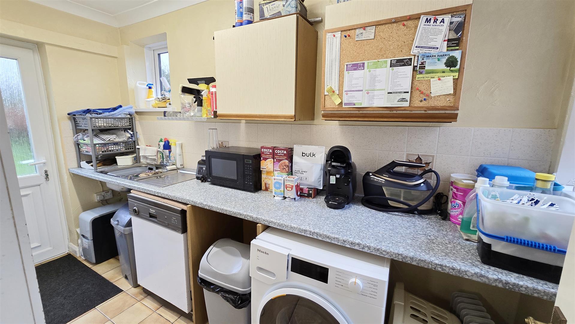 Coved and textured ceiling. Strip light. uPVC double-glazed privacy door to the rear. uPVC double-glazed window to the front. uPVC double-glazed high-level window to the side. Worktop with a tiled splashback and under-counter space and plumbing for a washing machine, space and plumbing for a dishwasher and space for additional appliances. 1 and 1/2 bowl stainless steel sink and drainer with a stainless steel mixer tap. Wall unit. Water softener. Double power-point and additional points for appliancces. Tile flooring.