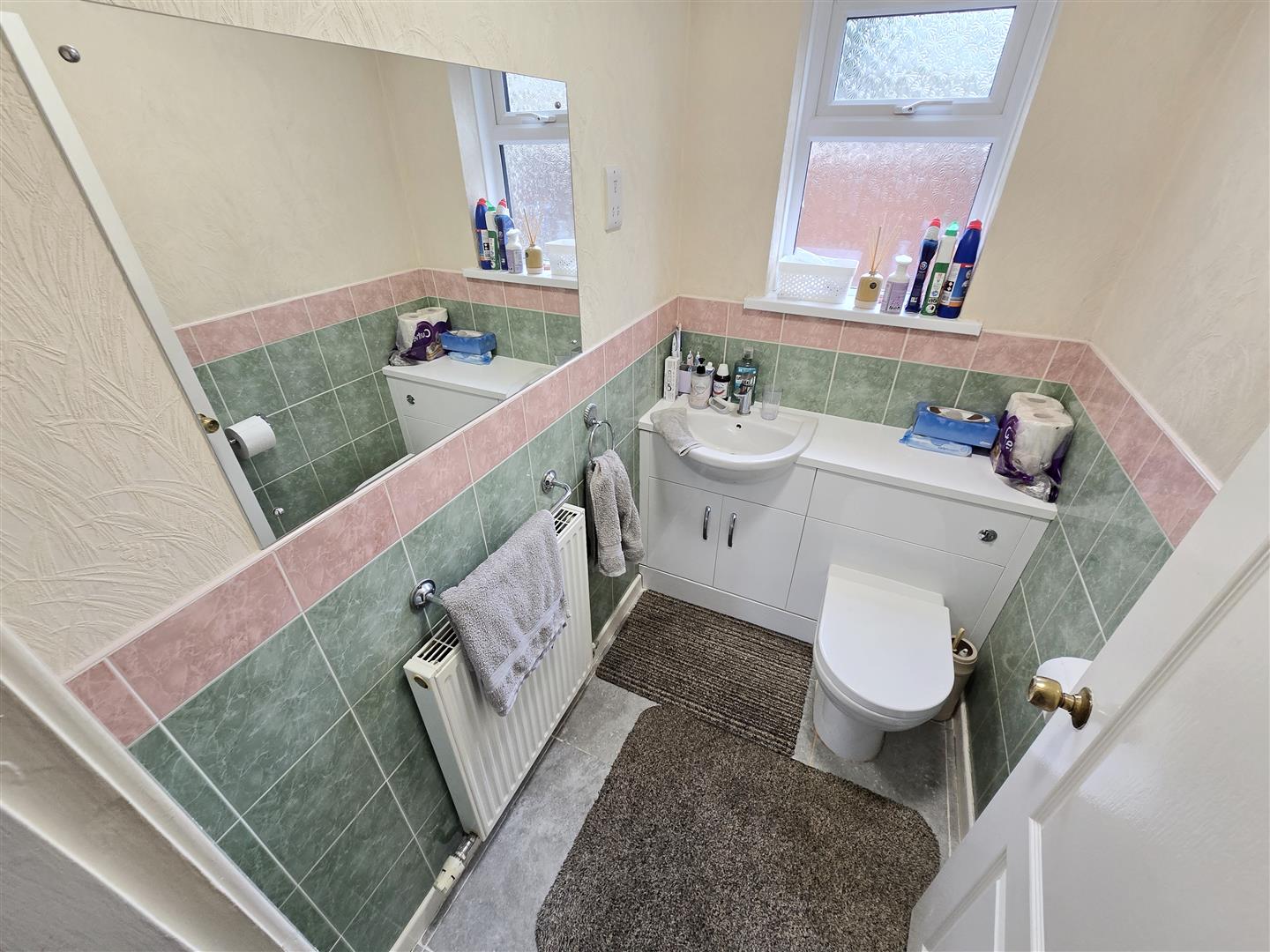 Ceiling light. uPVC double-glazed privacy window to the side. Vanity unit housing a hand basin with a stainless steel mixer tap and a low-level WC. Part-tiled walls. Radiator. Shaving point. Tile flooring.
