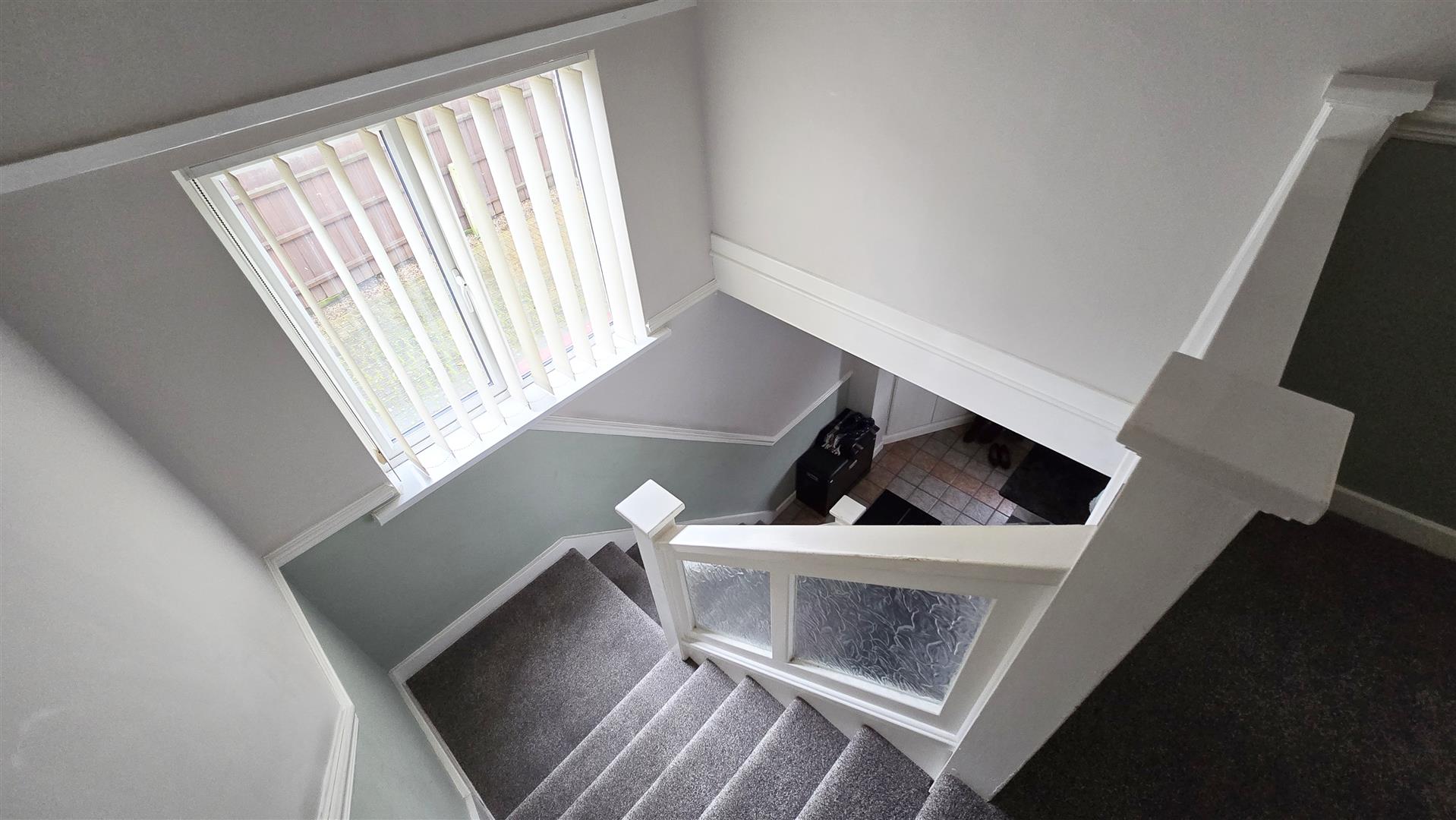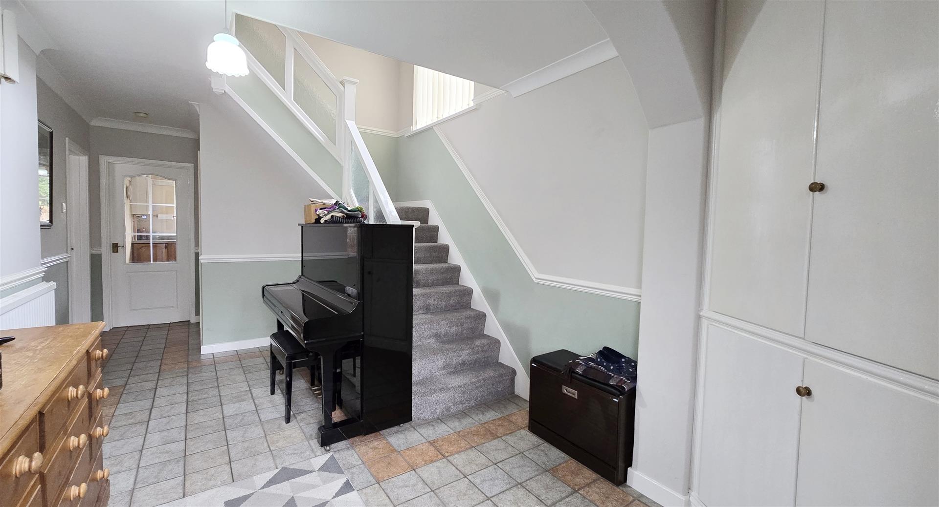 Coved and textured ceiling. Ceiling light. Smoke detector. uPVC double-glazed privacy door with uPVC double-glazed side panel to the front. Under-stair storage cupboard. Radiator. Tile flooring with carpeted stairs to the first floor.