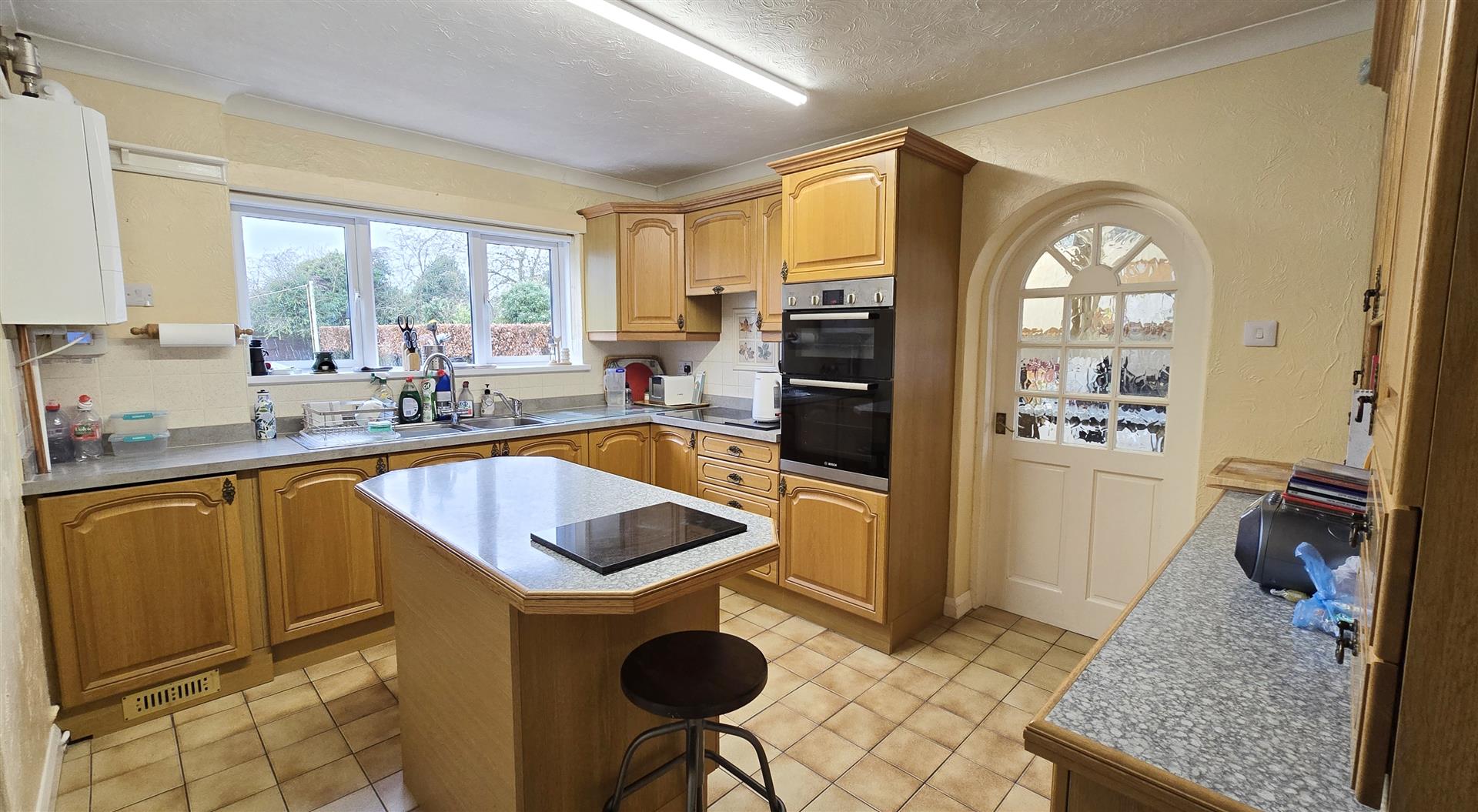 Coved and textured ceiling. Strip light. uPVC double-glazed window to the rear. Fitted range of matching wall and base units with a worktop over and a tiled splashback. 2 bowl stainless steel sink with drainer and 2 x stainless steel mixer taps. Centre island providing additional cupboard and worktop space with space for 2 breakfast bar stools. 'Bosch' eye-level oven and grill. 'Bosch' electric hob. Wall-hung 'Ideal' gas boiler. Radiator. Heating/hot water programmer. 3 x double power-points. Single power-point. Tile flooring.