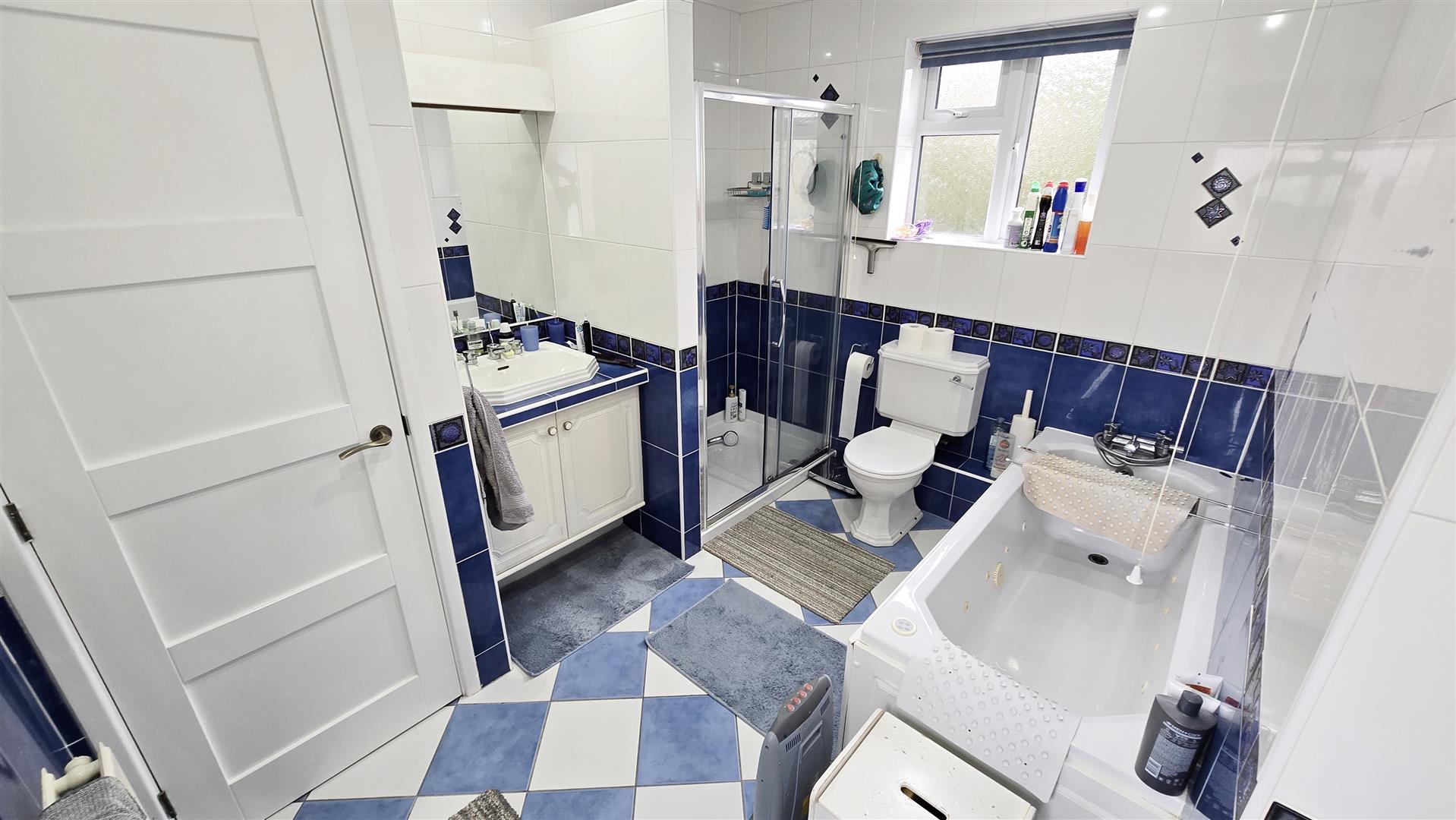 Coved and textured ceiling. Inset ceiling lights. 2 x uPVC double-glazed windows to sides. Airing cupboard measuring approximately 0.82m x 0.67m housing a hot water cylinder with shelving. 4-piece suite comprising of a vanity basin with a mirror with lights over, a low-level WC, a shower cubicle with a mains-fed shower and a spa bath. Radiator. Shaving point. Tile flooring.