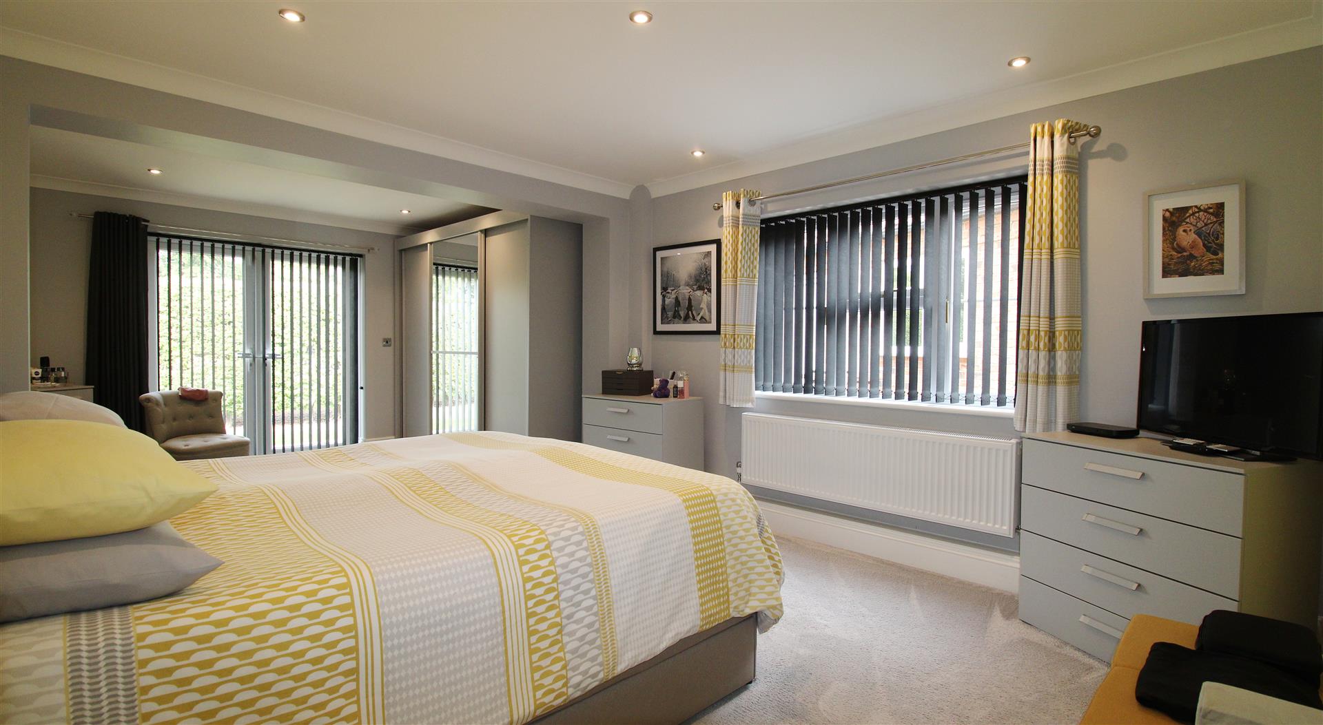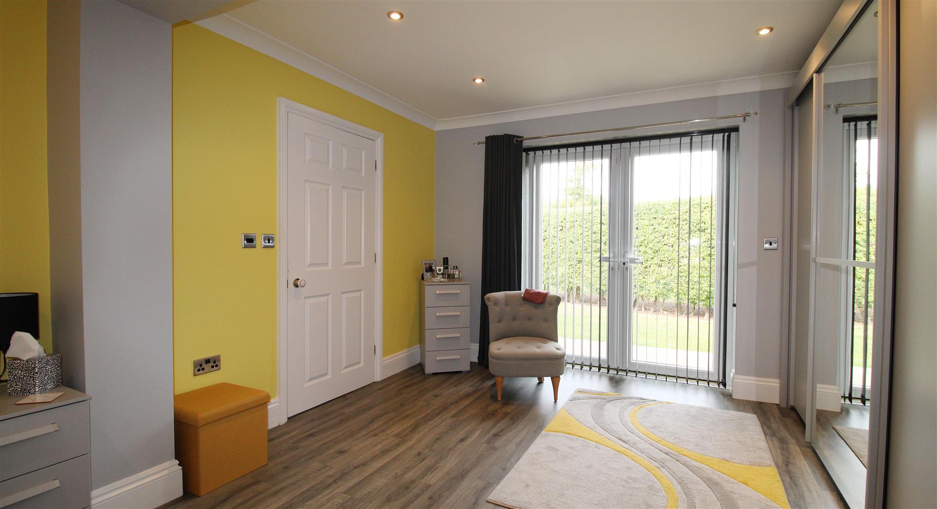 Coved ceiling. Inset ceiling lights. uPVC double-glazed window to the side. uPVC double-glazed French doors to the rear. Radiator. 4 x double power-points. TV point. Partly carpeted, with wood-effect laminate flooring to the dressing area.